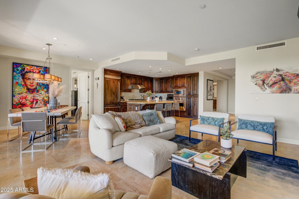 Experience the epitome of luxury living in the most sought-after address in Scottsdale,where this exquisite residence exudes warmth and unmatched comfort. Showcasing one of the building's most coveted floor plans,this home features dual master suites in a thoughtfully designed split configuration,offering both privacy and elegance. Also,a spacious den with private 1/2 bath is perfect for an office - or additional sleeping arrangements. Step outside to an expansive 350-square-foot balconyyour personal oasis of outdoor livingoverlooking the tranquil waterfront and fountain with coveted southern exposure,bathing the interiors in natural light and creating a luminous,uplifting ambiance throughout. Freshly painted and impeccably maintained with plush..... ...newer bedroom carpeting (travertine elsewhere throughout the home),this residence promises both sophistication and serenity. Nestled at the vibrant intersection of Scottsdale and Camelback Roads,you are mere steps from nearly 500 upscale boutiques,more than 85 renowned restaurants,almost 70 art galleries,and countless salons and spas,affording you the most pedestrian-friendly and dynamic lifestyle in the valley. This residence also includes two secure parking spaces and storage for your convenience. Indulge in the full-service amenities this esteemed building offers,representing the ultimate in refined Scottsdale living.