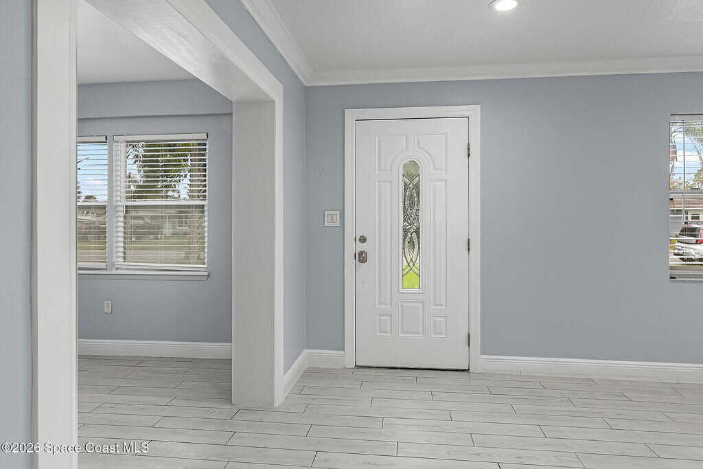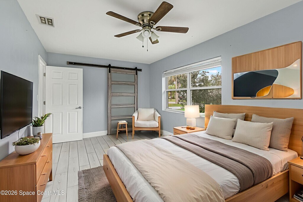 Beautifully updated 3 bedroom,2 bath home featuring a new 2024 roof and stylish modern finishes throughout. The interior offers new tile flooring,designer lighting,custom barn doors,and a fully remodeled kitchen with high-end appliances,sleek countertops,and a contemporary backsplash. Both bathrooms have been upgraded with elegant quartz finishes and modern fixtures. The spacious primary suite includes a large walk-in closet with custom built-in shelving. Enjoy outdoor living at its finest with a covered patio and a full luxury outdoor kitchen,ideal for entertaining year-round. The large fenced yard provides privacy,along with a secure shed for additional storage or workshop needs. Plenty of room to park your boat or RV with ease. Conveniently located just minutes from beaches,Kennedy Space Center,shopping,and dining. This move-in-ready property blends comfort,style,and functionalitytruly a must-see! MLS # 1065514