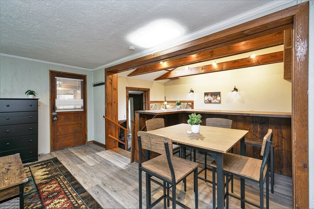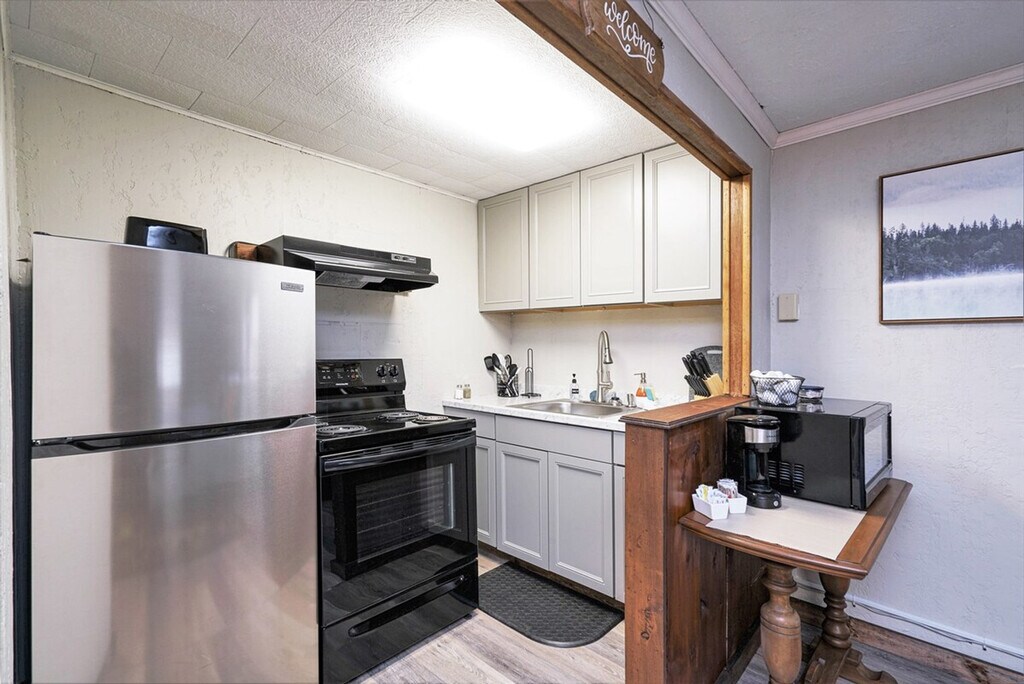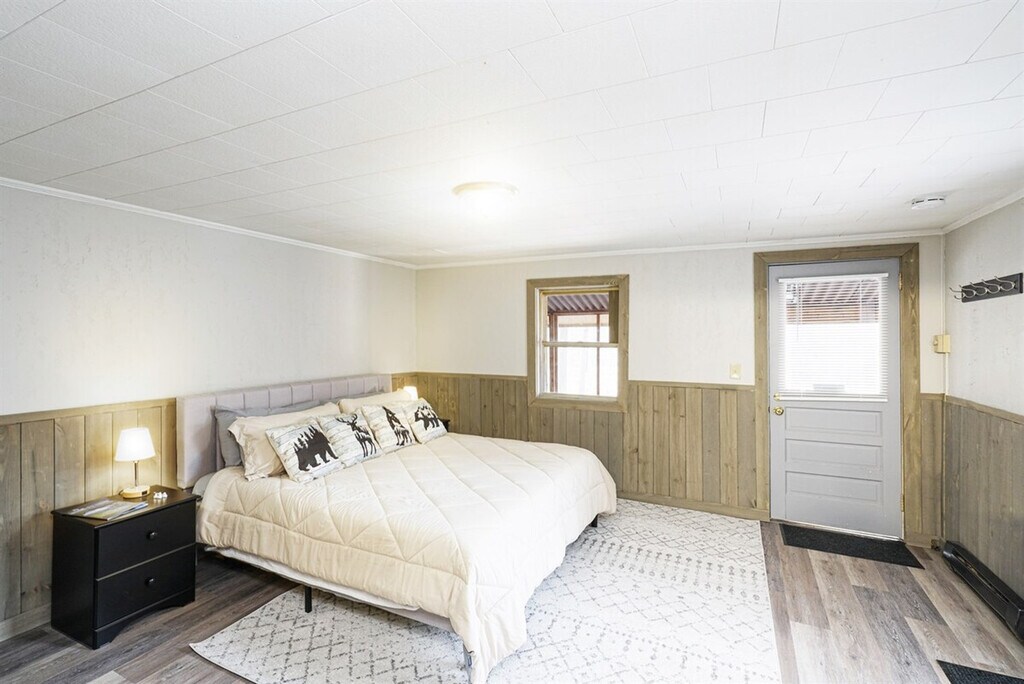 Feel at home in this beautiful cabin at the River Front Resort! You are renting two sides of a duplex-style cabin. One side is a small suite with a kitchen and bathroom, and the other side is a larger part with a kitchen, living room, and bathroom. There is no connecting door, but the walk between units is very short, just around the corner of the building. This cabin features a brand-new private hot tub for you to enjoy during your stay. The kitchen comes fully loaded with stainless steel appliances such as a fridge and electric stove, along with glasses, mugs, dishes, and cutlery. Complimentary coffee is provided. This unit is right on the river, great for fishing or any other wildlife adventures you may have. Free parking is available directly across the street. Even though the best Wi-Fi in the area is provided, this place is still in an area that internet isn't perfect. You may experience occasional interruptions due to this. Profiles with a review rating lower than 4 stars will not be allowed to book this property and new profiles without reviews will be subject to screening before a reservation may be confirmed. Guests love the awesome private hot tub, the professional cleaning and sanitization between each and every guest, the comfortable environment, the beautifully decorated space designed by a local with unique furnishings and warm ambiance, and the easy self check-in via secure door keypad. Some guests are not a fan of the split unit aspect of this house. [SI]