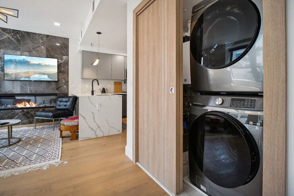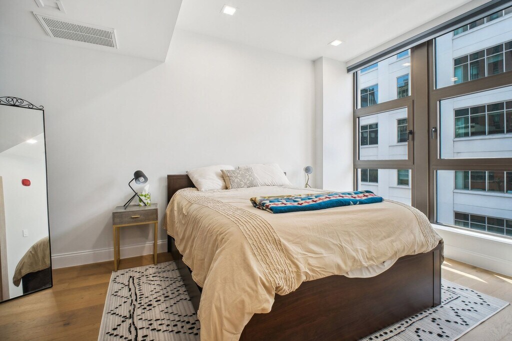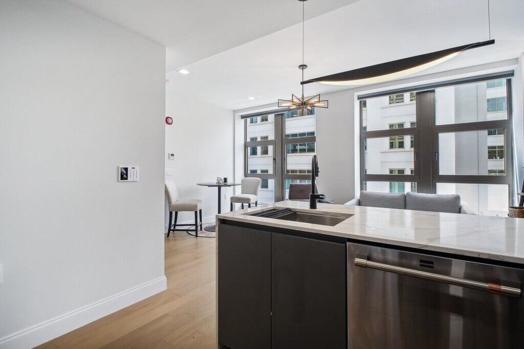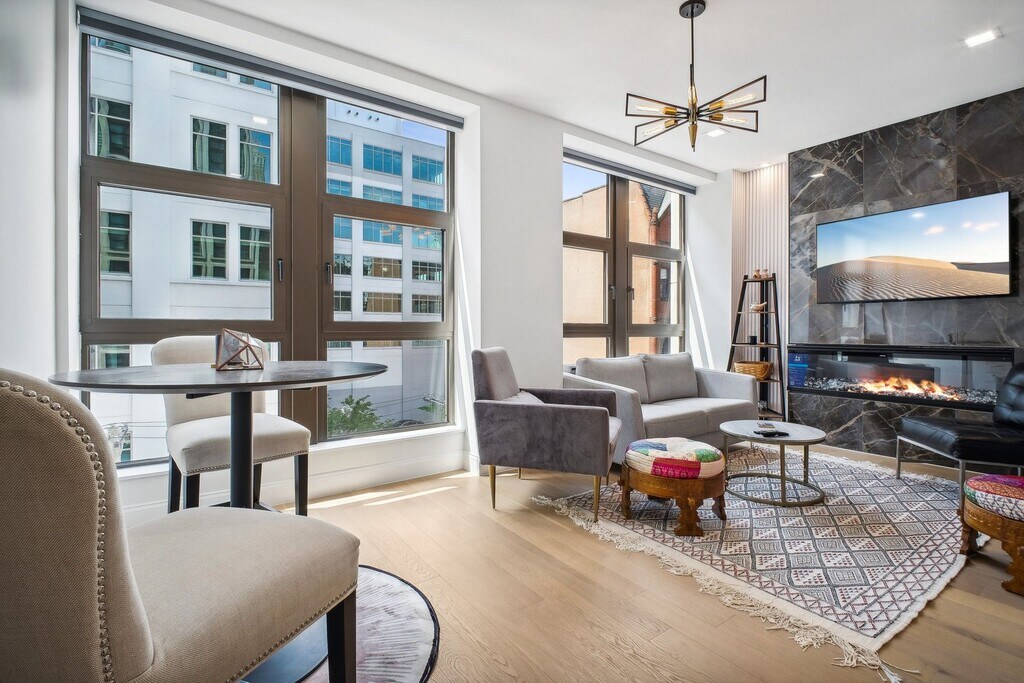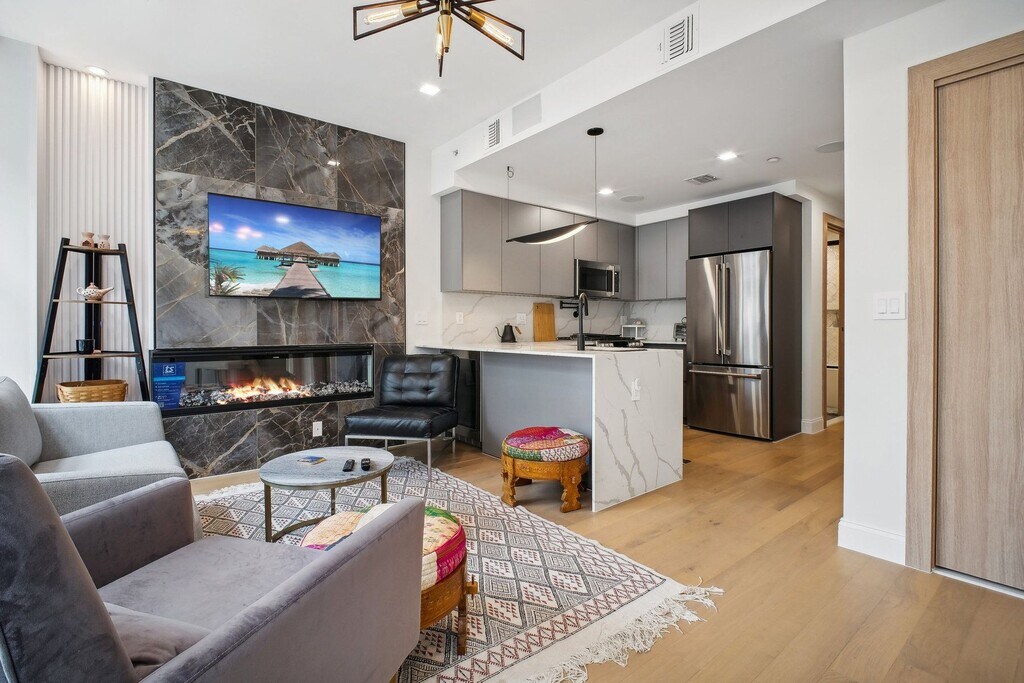 Welcome Home to 72 York Street - Luxury Living in Downtown Jersey City. An exquisite 11 story, 14 unit residential condominium building nestled in the heart of downtown Jersey City. This Furnished 1 bed/1 bath unit offers a total of 704 sq ft of well-designed living space, providing the perfect blend of comfort and sophistication. As you step inside, you will immediately notice the attention to detail and high-quality finishes throughout. Large windows fill the unit with natural light that gleams off the engineered hardwood floors. The kitchen is a chef's dream, featuring top-of-the-line appliances from Café, finished in brushed bronze. The cooking range, microwave, and wine cooler are designed to blend seamlessly with the kitchen's elegant aesthetics. The spacious bedroom is designed with your comfort and relaxation in mind. The layout is carefully planned, ensuring ample space for your furniture, allowing you to arrange the room to suit your personal style and preferences. The spacious closet provides an abundant of storage space for your wardrobe and personal belongings. The bathroom is adorned with customized vanities and illuminated mirrors, adding a touch of elegance to your daily routines. Immerse yourself in an unparalleled audio experience with the Sonos Surround speaker system that extends throughout the unit, setting the perfect mood for any occasion.The illuminated chandeliers and pendant lights along with the Dimplex fireplace are perfect finishing touches to the unit creating a warm and inviting ambiance. Enjoy the convenience of a rooftop deck with stunning downtown views and barbeque stations, and a gym/lounge area with a rear yard for relaxation and socialization. Located in the Jersey City waterfront , this steel and concrete building offers proximity to Manhattan, with seamless access to PATH trains, ferries, and buses, you can effortlessly navigate the bustling cityscape while enjoying the tranquility of your urban sanctuary. The unit is provided furnished with furniture shown in photos.