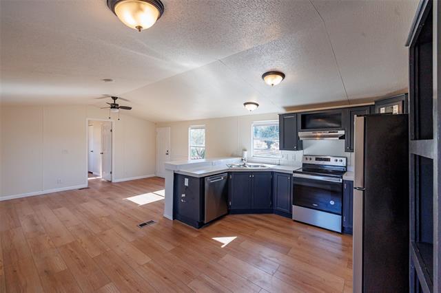 Recently updated single-wide manufactured home for rent in the community of Sky Harbour. 2 bedroom, 2 bath, 896 square feet, built in 2006. Metal siding, metal roof, and located on a very roomy lot with a seasonal creek behind the home. Open living area, updated kitchen, breakfast area, split bedrooms. Recent updates are new vinyl flooring throughout, fresh paint inside, updated kitchen, both bathrooms updated. Primary bathroom has a wonderful oversize walk in shower, elegant cabinets, double sinks, and a very modern look. Kitchen has refrigerator, cooktop stove, dishwasher, and microwave. Front deck, large walk out covered deck off the primary bedroom, and a third exit door with a walk out perch. Includes a nice 1 car metal carport. Chain link fenced backyard. Great location off Highway 51 with close proximity to Granbury and Weatherford. HOA offers Lake Granbury access, community pool, community park, community fire department, and more!