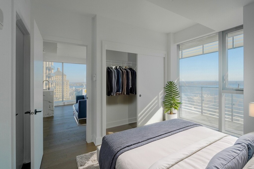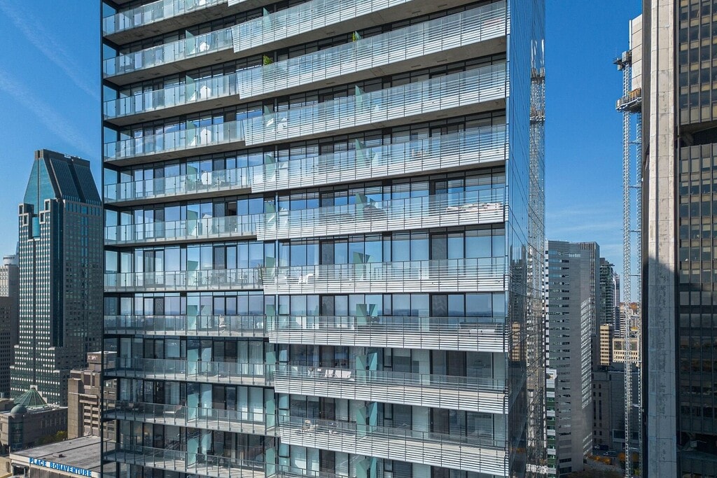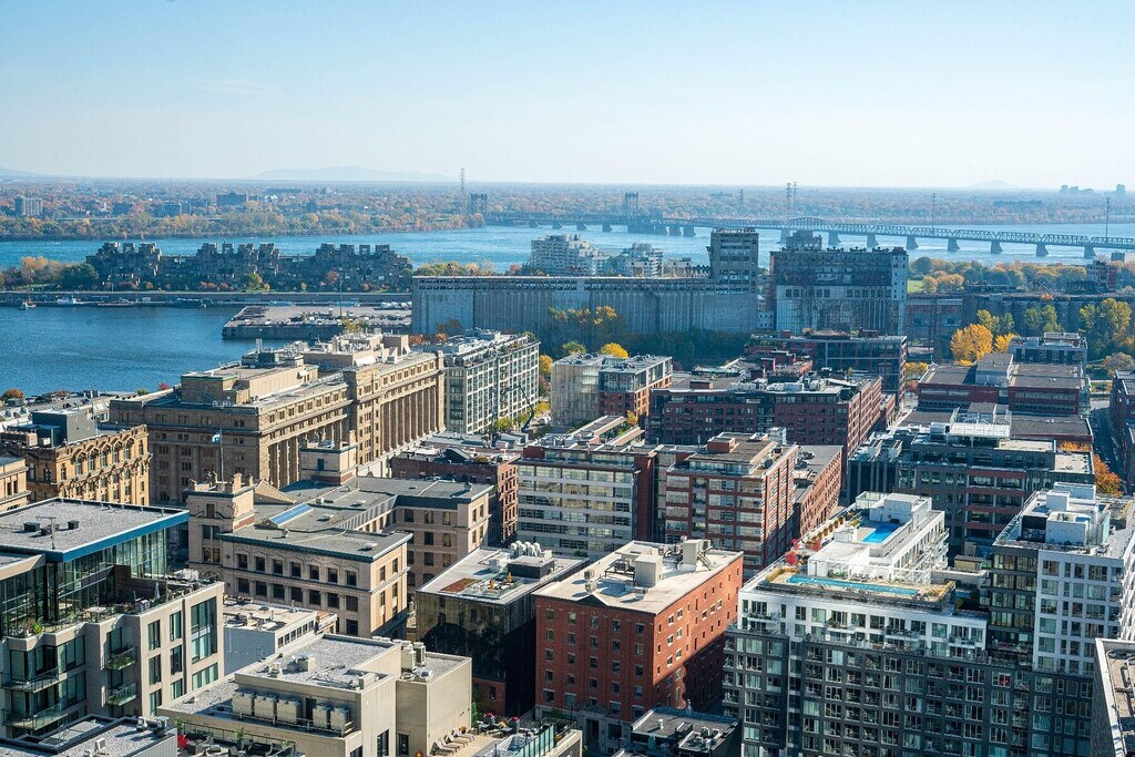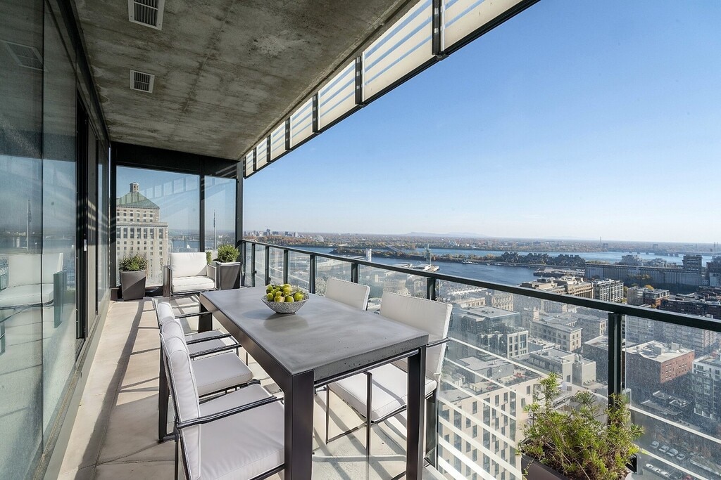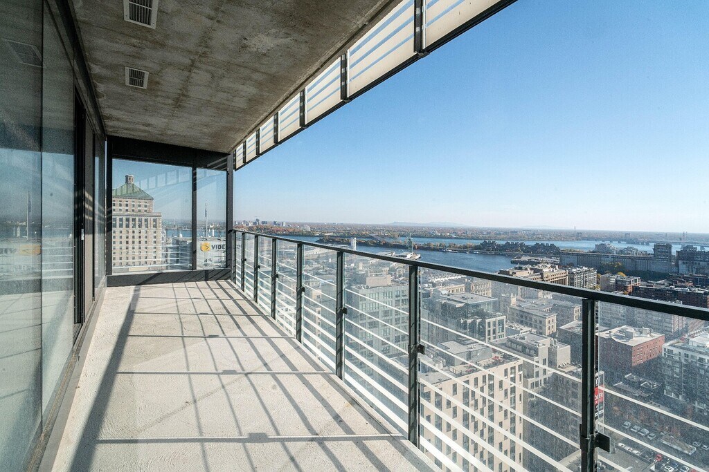 Stunning brand new 2 bedroom, 2 bathroom corner unit boasting spectacular 360 degree city, river and mountain views! Located on the 27th floor of Victoria sur le Parc, in the heart of Old Montreal, this bright and airy unit boasts an open concept kitchen, living and dining area with floor to ceiling windows bathing the space in natural light and offering breathtaking views of the city, the River. Glass doors give access to a large balcony overlooking the St-Lawrence River, an ideal spot to take in the views or to enjoy the summer months.