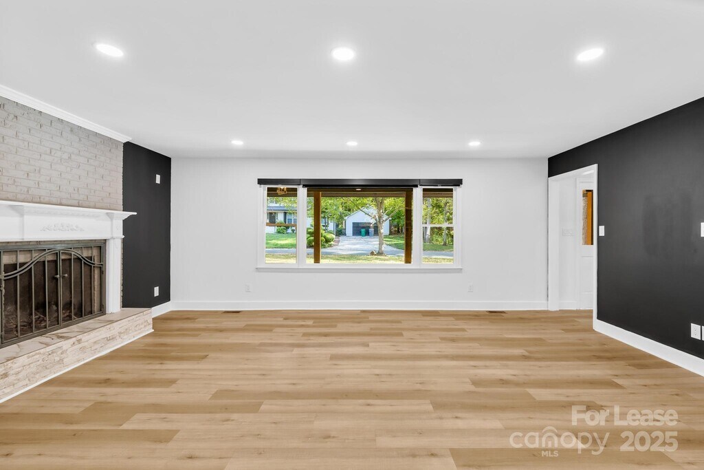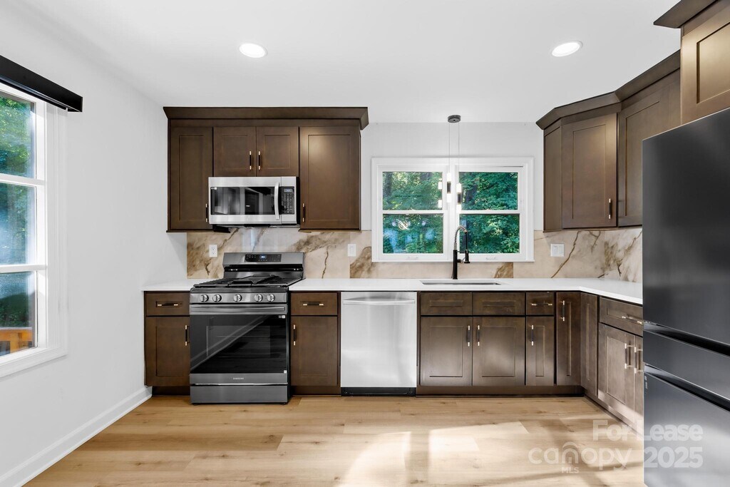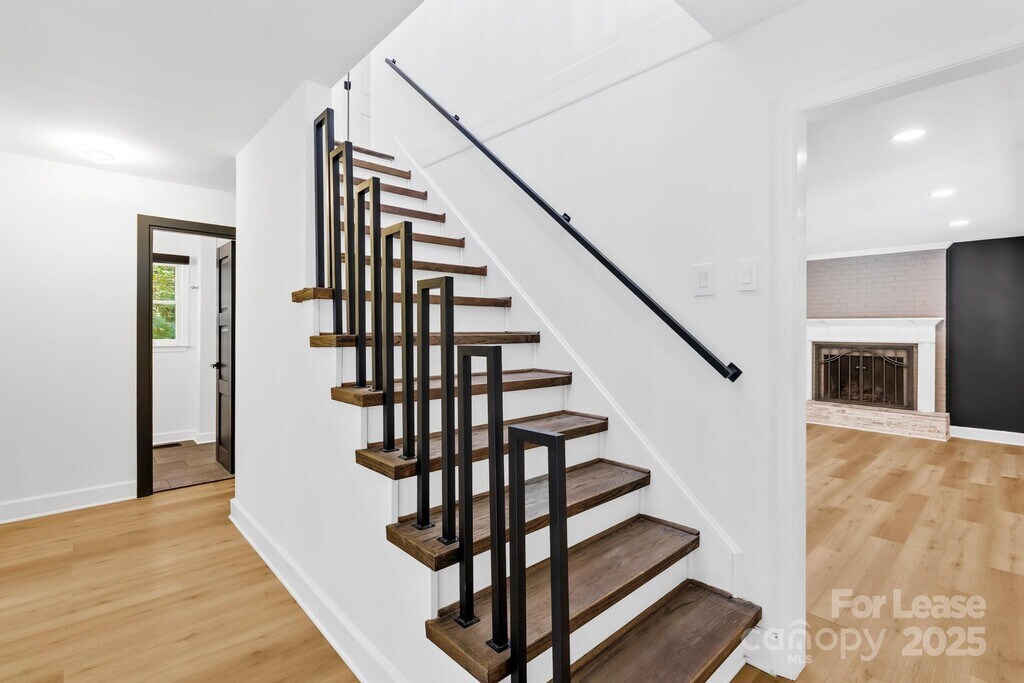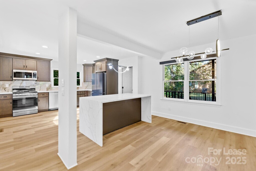 Set on over half an acre,this beautifully renovated home is a rare find in today’s rental market. Thoughtfully renovated with designer finishes,it boasts a welcoming front porch,a bright,open layout with a spacious kitchen,elegant designer lighting,spa-inspired bathrooms and upgraded flooring throughout. The main floor features a open floor plan,a spacious kitchen with a large island,overlooking a dining area,and the living room,a laundry room,a dedicated office that can double as a fifth bedroom,a main-floor bedroom,and a full bath. Upstairs,the generous primary suite boasts an en suite with dual vanities and a walk-in closet,accompanied by two additional bedrooms and a full bathroom. Step outside onto the back deck with large umbrella for added shade and enjoy your own private backyard retreat - perfect for morning coffee,weekend gatherings,or quiet evenings under the stars. Charming side porch adds a bonus outdoor space. Additional highlights include garage parking with ample storage,a security system,and lawn care included. Ideally located near Toby Creek Parkway for nature walks,just a short drive to UNC Charlotte,and minutes from the light rail for an easy Uptown commute. This home seamlessly blends luxury,privacy,and convenience,making it an exceptional rental opportunity.