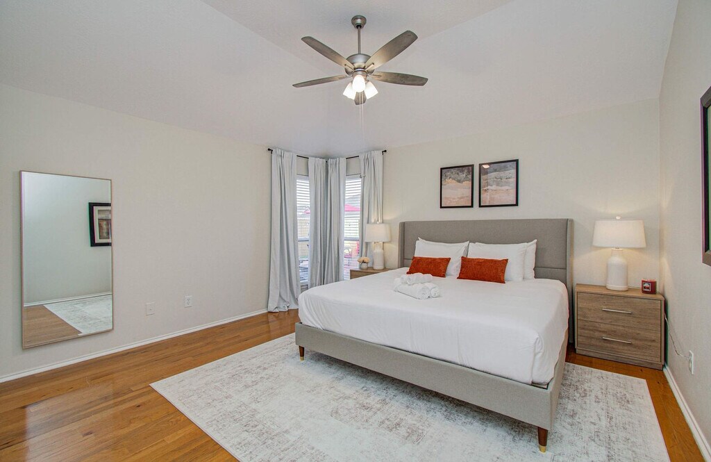 The advertised rate of $6,573/month is the lowest available price, based on a 1 month(s) stay with a move-in date of April 25, 2026. Rates vary depending on the duration of stay, season, and other parameters. For exact pricing and additional pricing components, please visit our website and enter your desired move-in and move-out dates. The rate is applicable when billed upfront; it can be higher if billed in multiple payments. Feel at home in this vacation home conveniently located in the Bellaire View area. This home features fantastic accommodations, indoor entertainment, and a decked-out backyard. Furnished with meticulous attention to detail, this place features a timeless style. This home has 4 bedrooms and 3 bathrooms. This fully equipped kitchen has everything you need to unleash your culinary genius, including appliances such as a fridge, stove, oven, dishwasher, and microwave. There is also a dedicated coffee station. The dining area provides a restaurant-like environment with a dinner table with seat settings for 8, modern light fixtures, carefully selected artwork, and touches of greenery. The living room offers the perfect balance of warmth and coziness, with a couch and armchairs, coffee tables, a designer rug, a flat-screen TV, and high-speed Wi-Fi. Be sure to indulge in both the indoor and outdoor entertainment. Spend some time on the patio enjoying a tasty barbecue meal or warm, flickering flames around the fire pit. Then crank up the friendly competitive spirit in the game room with some table tennis or board games. The laundry room is also fully equipped with a washer and dryer available for your use should you need to refresh your clothing during your stay. This home caters for both short-term and medium-term stays, making it an excellent choice for corporate housing needs. Welcome to Houston! Houston is known for many things, from tasty Tex-Mex to contributions to space and science. While you’re here, be sure to check out the culinary scene. Nearby attractions include the Houston Arboretum & Nature Center (20 min drive), Downtown Aquarium (25 min drive), NRG Stadium (20 min drive), and The Houston Museum of Natural Science (25 min drive). If you arrive by car, you will be happy to know that free parking is available. If driving is something you would like to avoid during your stay, Uber and Lyft are only minutes away 24/7. Smoking of any type is not allowed, and violations are subject to a $450 fine plus the cost to clean, deodorize, and repair damages. Check-in is at 4pm and check-out is at 10am. Only registered guests will be allowed. A noise alert device has been installed in our home to comply with local noise ordinances and occupancy regulations, and prevent unauthorized parties. This device does not record nor store sound data. Pets should be discussed in advance, and only house-trained pets are allowed. An additional nightly rate applies for more than six guests. The primary bedroom has a king-size bed and an en-suite bathroom. There are 3 additional bedrooms with queen and bunk beds. The backyard is fully fenced for your privacy. [SI]