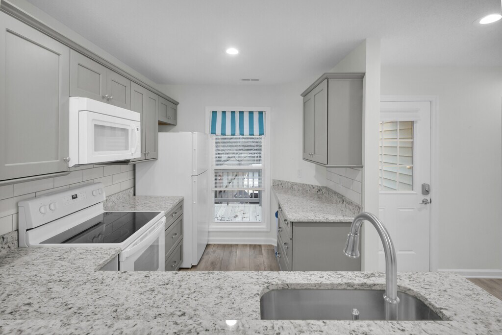 Welcome to this well-appointed 2-bedroom, 2-bathroom condo located in the desirable Fairfield Harbour community. Enjoy peaceful water views from the Carolina room, offering a serene space to relax and unwind. The fully equipped kitchen features abundant granite counter space, ample cabinetry, and modern appliances including a refrigerator, dishwasher, oven, and built-in microwave. The kitchen opens seamlessly to the main living area and includes a pantry with shelving for added storage. Outdoor living is a highlight with both a front patio and a rear deck overlooking the water—perfect for enjoying the coastal Carolina lifestyle. The primary bedroom offers beautiful water views, a spacious walk-in closet, and an en-suite bathroom with a double-sink vanity and a large walk-in shower. The second bedroom is generously sized and also includes a walk-in closet. Washer and dryer hookups are conveniently located in a dedicated laundry closet. Located in Fairfield Harbour, residents can enjoy a tranquil setting with access to community amenities and scenic surroundings.