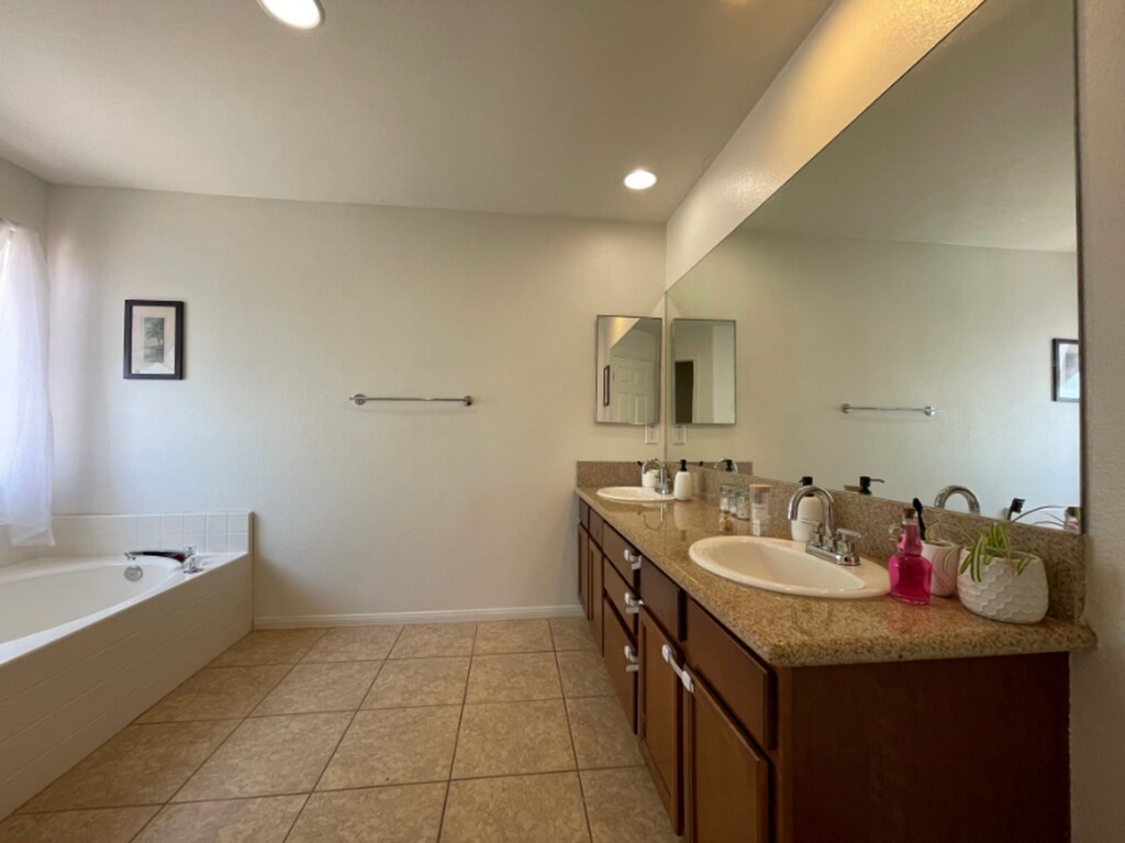 MOVE IN SPECIAL! $500 OFF FIRST MONTH'S RENT!! Don't miss this special deal! This beautiful home features 4 bedrooms, 2 full bathrooms. Primary bedroom has walk-n closet, soak tub with separate stand-up shower and toilet in its own space. The home has ample space in the kitchen and living room giving you room to move around. Kitchen comes with stainless steel appliances that include dishwasher, stove, microwave, and refrigerator. Kitchen has access to the back yard off dining room and primary bedroom. SOLAR!! All rooms have ceiling fans and HVAC system to keep cool during the summer months Great, fenced back yard that is private and provides a lovely space to enjoy summer nights and a great space for your dog to run