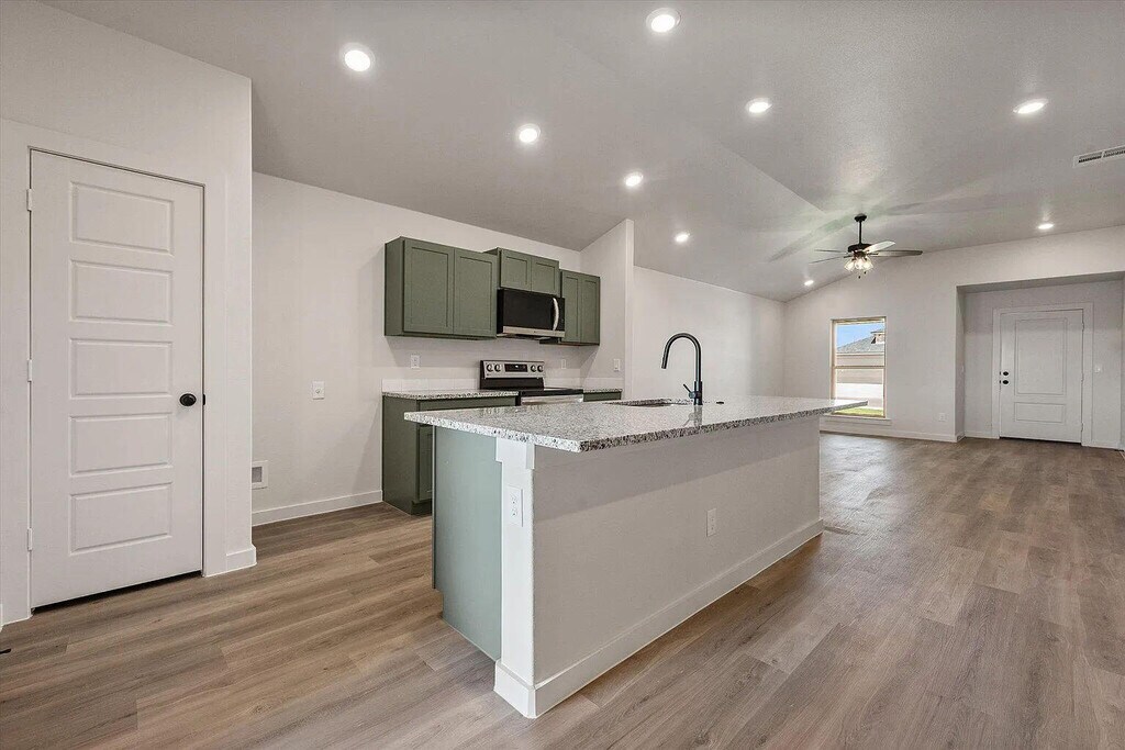 For Rent! New Construction 3/2/2 in Frenship School District! This well-designed home features luxury vinyl plank flooring throughout the kitchen,living,and dining areas. The open-concept kitchen includes a large island with bar seating,stainless steel appliances,and a pantry. Isolated master with a spacious walk-in closet. Large backyard with covered front and back patios.