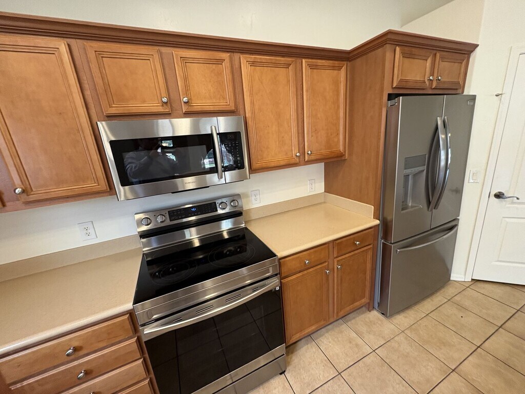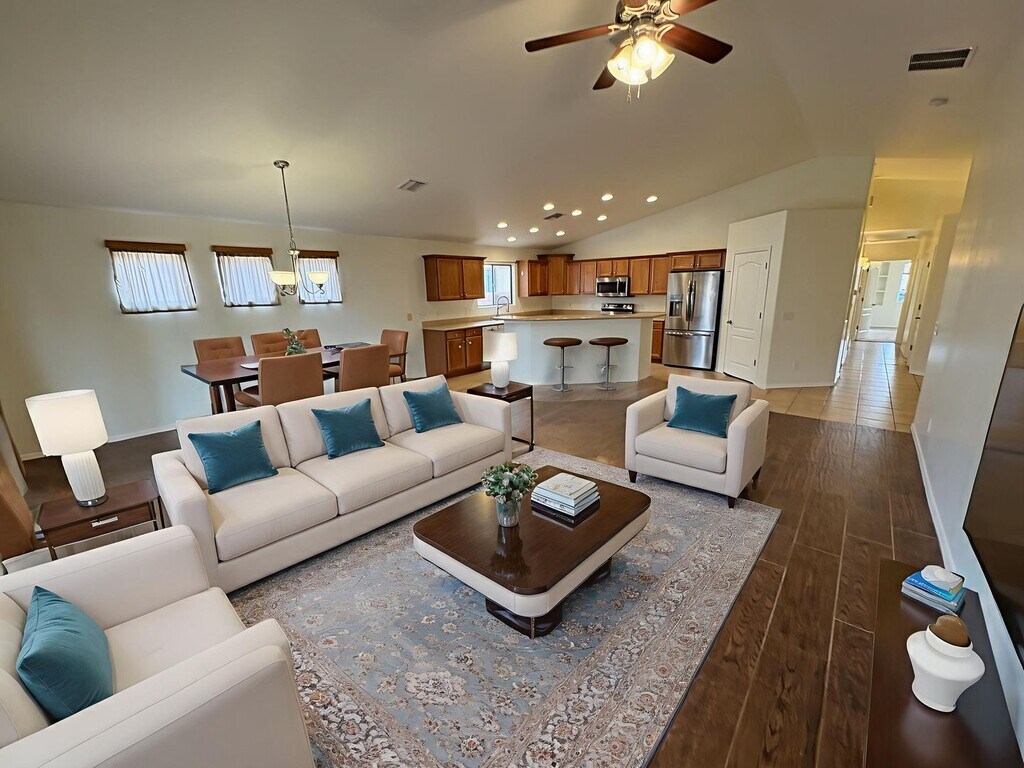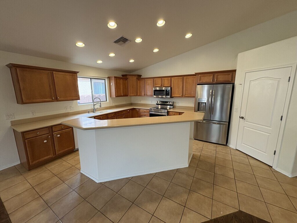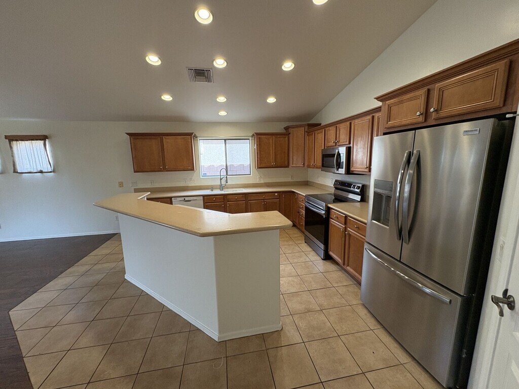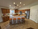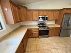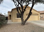 Welcome to this stunning all electric 3-bedroom, 2.5-bathroom home located in the vibrant city of Tucson, AZ. This property boasts a range of high-quality amenities, including a water softener system, ceiling fans throughout, and a pet-friendly environment. The flooring is predominantly tile, with the exception of two guest bedrooms. The kitchen is a chef's dream, featuring Corrian countertops, a large island with a breakfast bar, and upgraded cabinets. All kitchen appliances are included, along with a washer and dryer for your convenience. The master suite is a haven of luxury with two closets and an executive height vanity with dual sinks. The home is equipped with a solar system, ensuring low energy bills. The outdoor space is equally impressive, with a covered patio and large extended paver patio, an outdoor kitchen complete with a refrigerator, sink, BBQ, and granite countertop, and lush artificial turf. With no rear neighbors, you can enjoy your outdoor oasis in privacy. This home is a perfect blend of comfort and modern living.