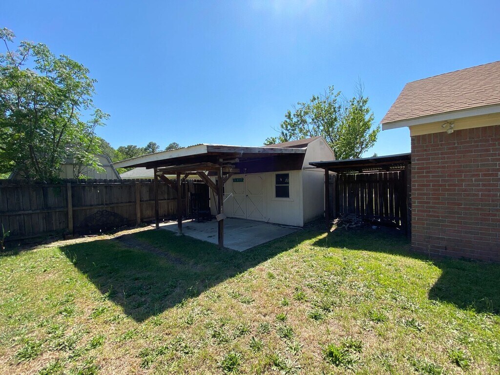 Welcome to this inviting 4-bedroom, 2-bath, 1,434 sq. ft. ranch-style brick home located in the desirable Waterfield subdivision of Hinesville, GA. This single-story residence offers a welcoming covered front porch and a spacious layout designed for both comfort and functionality. The beautiful eat-in kitchen is a standout feature, showcasing custom built-in cabinetry, abundant counter space, and plenty of storage. The versatile fourth bedroom sits just off the kitchen and can serve perfectly as a den, office, or flex space. The primary suite includes a large walk-in closet and an en suite bath with a sleek glass-door shower for a modern touch. Enjoy easy maintenance with no carpet throughout, and take advantage of the designated laundry area complete with a washer and dryer. Outside, the large backyard is fully enclosed with a 6-ft wood privacy fence and features an oversized patio, along with a covered shed —ideal for storage and outdoor hobbies. Conveniently located off Airport Road near Hwy 196, this home places you within minutes of Fort Stewart’s Gate 7 and Gate 8, and offers a quick commute to Richmond Hill and Savannah.