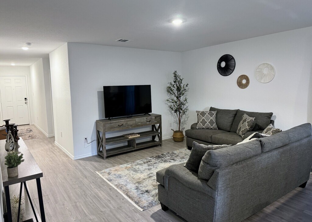 Welcome to our luxurious FULLY FURNISHED home, ideally situated in one of New Braunfels' most convenient locations! With 1,300 square feet of space, this home is perfect for longer stays and accommodating big groups. You'll enjoy fast Wi-Fi, brand new comfortable beds and a peaceful backyard with a patio set, grill and firepit for enjoying those beautiful days outside. Rest assured, our home is professionally cleaned and sanitized for your peace of mind. LOCATION! LOCATION! LOCATION! Centrally located between San Antonio and Austin, our home offers easy access to downtown New Braunfels, Schlitterbahn Water Park, and river floating adventures and Canyon Lake THE SPACE: Room 1 has a king size bed Room 2 has a full bed Room 3 has full over full bunk bed This stylish home boasts a fully equipped kitchen allowing for easy meal preparation, breakfast table, large closets, a laundry room with a full-size washer/dryer and a spacious backyard ideal for outdoor activities. Whether you're playing games or making s'mores on the patio, there's something for everyone to enjoy.