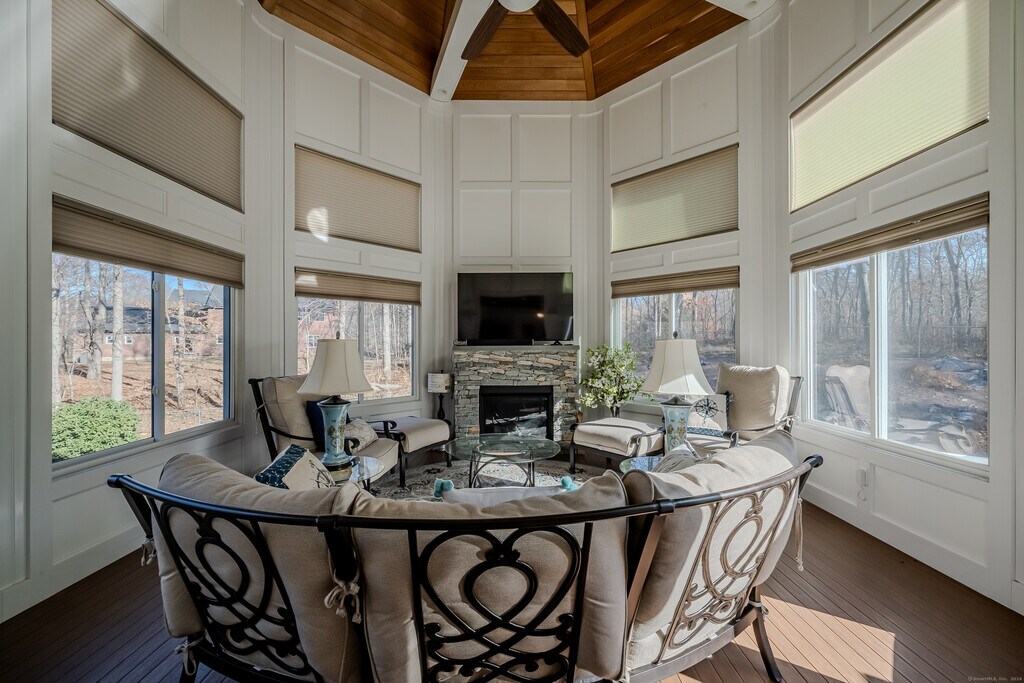 Call for Availability - Located on a serene cul-de-sac in desirable Orange, this beautifully designed 4-bedroom, 3.5-bathroom contemporary home offers luxurious living and modern charm. The property features an inviting two-story foyer that opens to a bright, airy interior with hardwood floors throughout. The living room is a true showstopper, showcasing a vaulted ceiling, dramatic stone fireplace, and oversized windows that fill the space with natural light. The custom eat-in kitchen is a culinary haven, equipped with Wolf appliances, Sub-zero fridge, granite countertops, and two generously sized islands! Adjoining is the cozy breakfast nook, overlooking the private backyard and enhanced by a vaulted ceiling, skylights and window surrounds. Exquisite octagonal sunroom, complete with a soaring ceiling and a gas fireplace, provides year-round comfort and charm. The primary suite is a true retreat with a vaulted ceiling, double vanities, and a spa-like soaking tub and dual head steam shower for ultimate relaxation. Three additional large bedrooms offer plenty of room for family or guests. Recently updated walk-out basement adds versatile living space, ideal as a playroom, home gym, office, or even an in-law suite. Situated just a short stroll from the town center and quick drive to Routes 34 and 15, this home offers both convenience and accessibility for an easy commute to New Haven, Yale or commute to NYC. For those who appreciate quality and elegance along with functionality, take a tour today! MLS# 24142101