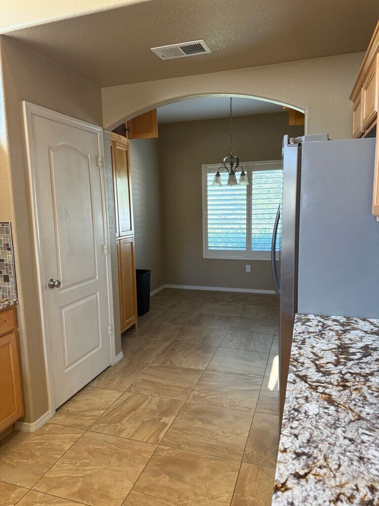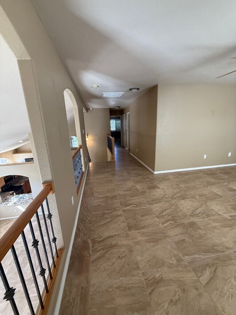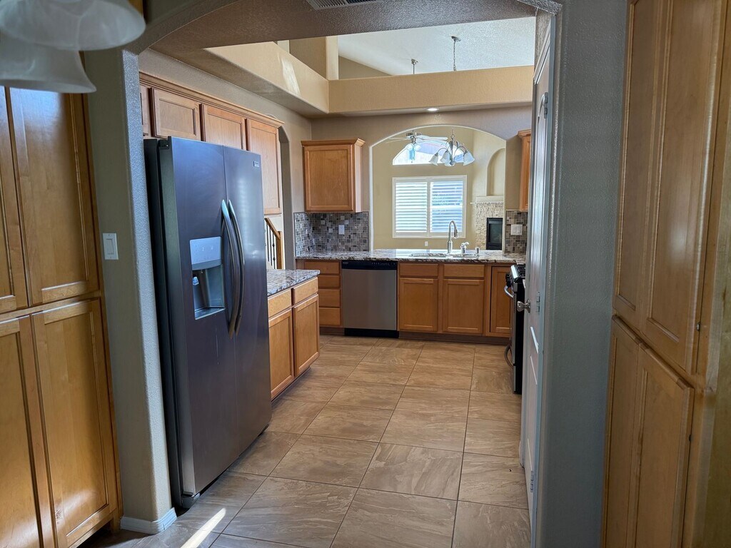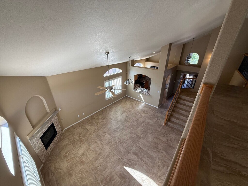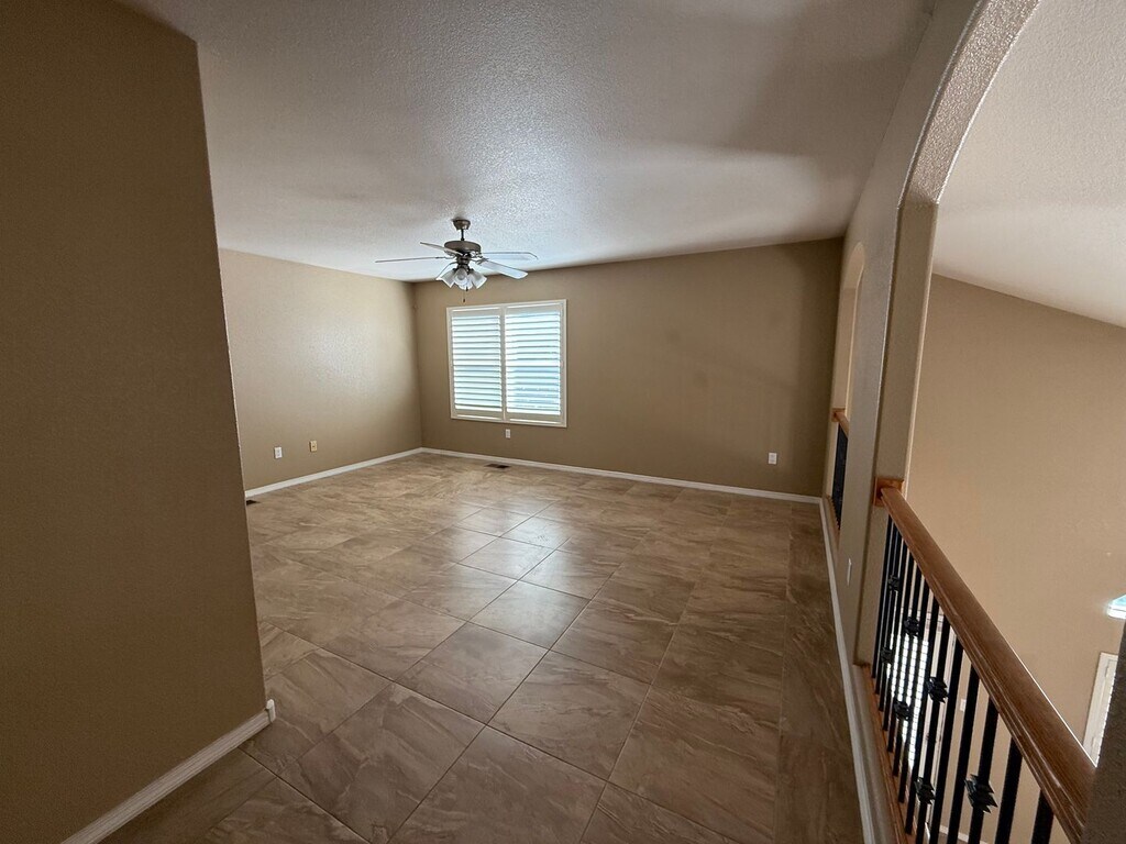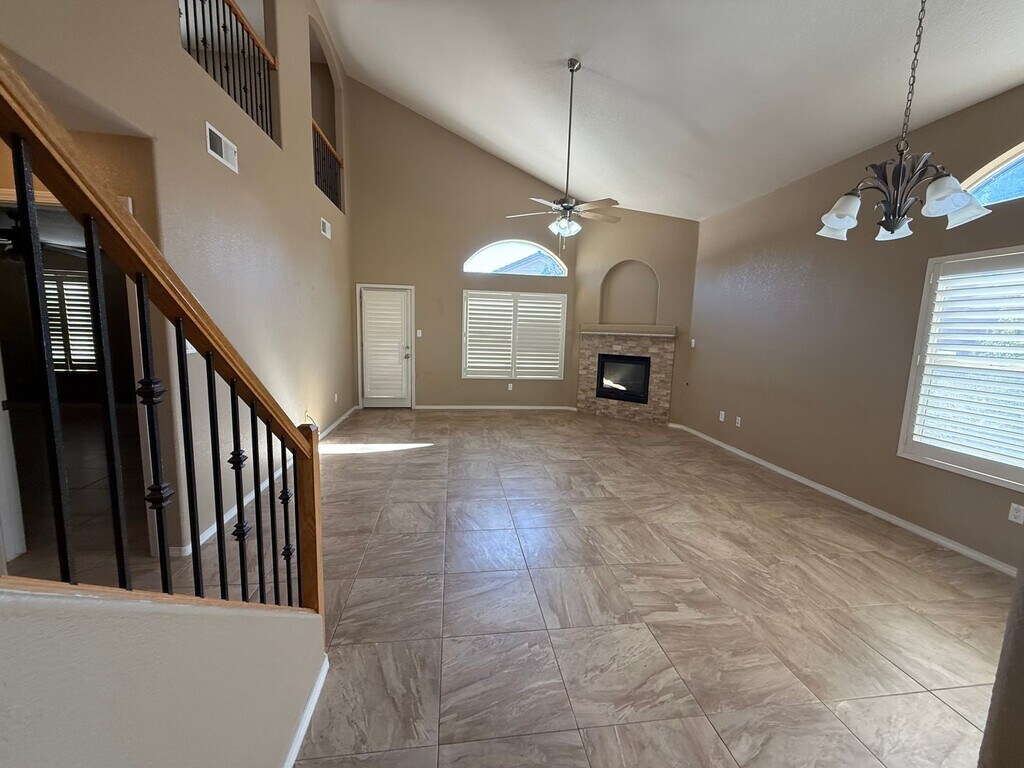 This property featuring 2,078 sq ft with three bedrooms, 2.5 bathrooms, and a spacious loft. The home boasts tile flooring throughout. The kitchen has been completely updated with granite countertops, stainless steel appliances, a custom backsplash, a refrigerator, and a pantry. There is a separate formal dining area, and the living room offers a custom gas fireplace and raised ceilings. The primary suite is located on the first floor and includes a private bath with a large vanity, a garden tub, a walk-in shower, and a walk-in closet. A beautiful wrought iron staircase leads to the loft area and two guest bedrooms. The private backyard features a covered patio and artificial turf. Additionally, a park is conveniently located directly across the street.