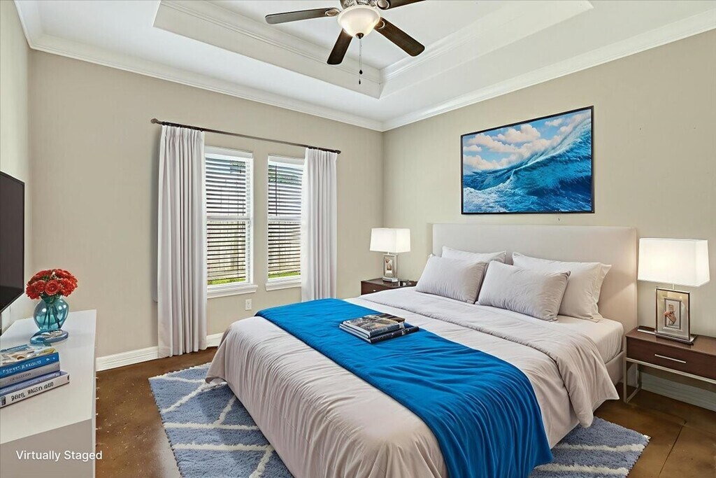 This beautiful 4-bedroom,2-bath rental home is located in the gated community of Lake Placid Estates in Corpus Christi’s desirable Southside. Built in 2016 and tucked into a quiet cul-de-sac,this residence features soaring ceilings,an open floor plan,and abundant natural light that highlights the granite countertops and stained concrete flooring throughout—no carpet. The primary suite includes a walk-in closet,dual vanities,and a large tiled shower,while the fully fenced backyard with a covered patio offers a private outdoor retreat. Rent includes the kitchen refrigerator,and a security system is available for optional tenant monitoring. Ideally situated off Rodd Field Rd and Saratoga,the home is minutes from shopping,dining,hospitals,and major employers. Pets welcome with owner approval and $250 refundable pet deposit per pet. Application fee is $47 per person. Don’t miss your chance to live in one of Corpus Christi’s few gated neighborhoods. Schedule your showing today! MLS# 59063247