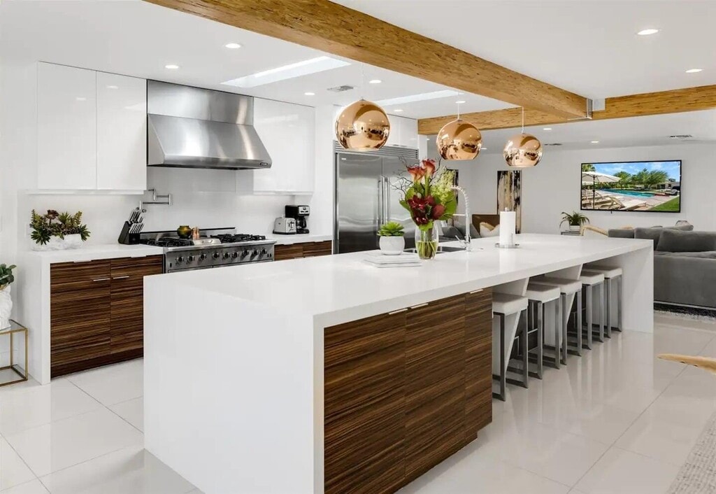 Welcome to our stunning vacation rental,where luxury meets the comfort of home. Say hello to your dream getaway at Desert Las Palmas,a stylish mid-century modern home that captures the essence of Rancho Mirage's glamour and sophistication. Get ready to indulge in the ultimate relaxation as you step into this thoughtfully re-imagined oasis. With breathtaking mountain views and 19,166 square feet of land for unrivaled privacy,you'll feel like you've entered a true desert paradise. Located in the heart of Rancho Mirage,just a short stroll away from the renowned outdoor shopping and dining destination,The River,Desert Las Palmas offers convenient access to all the pleasures the city has to offer. Inside,you'll find a beautifully designed,fully-stocked kitchen,featuring new stainless steel appliances,a side-by-side fridge,a gas stove,and sleek quartz countertops. Enjoy the intimate setting of the kitchen as you prepare a quiet dinner or entertain friends and family around the bar seating for six. Adjacent to the kitchen is a stunning dining area,complete with a glass table and comfortable seating for eight. The open floor plan invites you to seamlessly transition from the chic interior to the magnificent backyard. Experience true indoor-outdoor living as the glass sliders connect you to your private pool oasis. With a mix of mid-century and modern furnishings,vibrant art,and captivating lighting,this vacation home offers a sophisticated and stylish experience that will delight the entire family. But there's more - coming soon! We're proud to announce the addition of a brand new,on-site professional pickleball court,set to be completed on December 15th. Get ready to engage in exhilarating matches with your loved ones and create lasting memories right in your backyard. Escape to Desert Las Palmas and discover the perfect blend of luxury,charm,and entertainment. Book your unforgettable stay with us today and let the vacation of your dreams become a reality.
