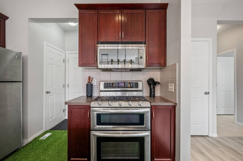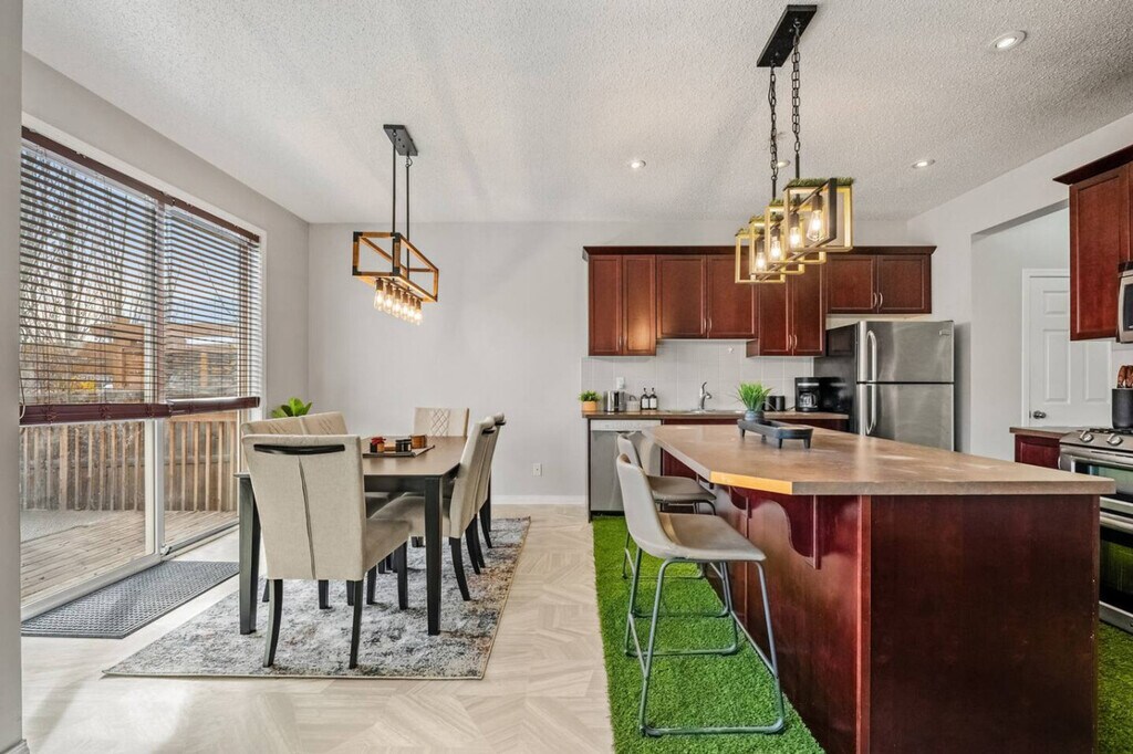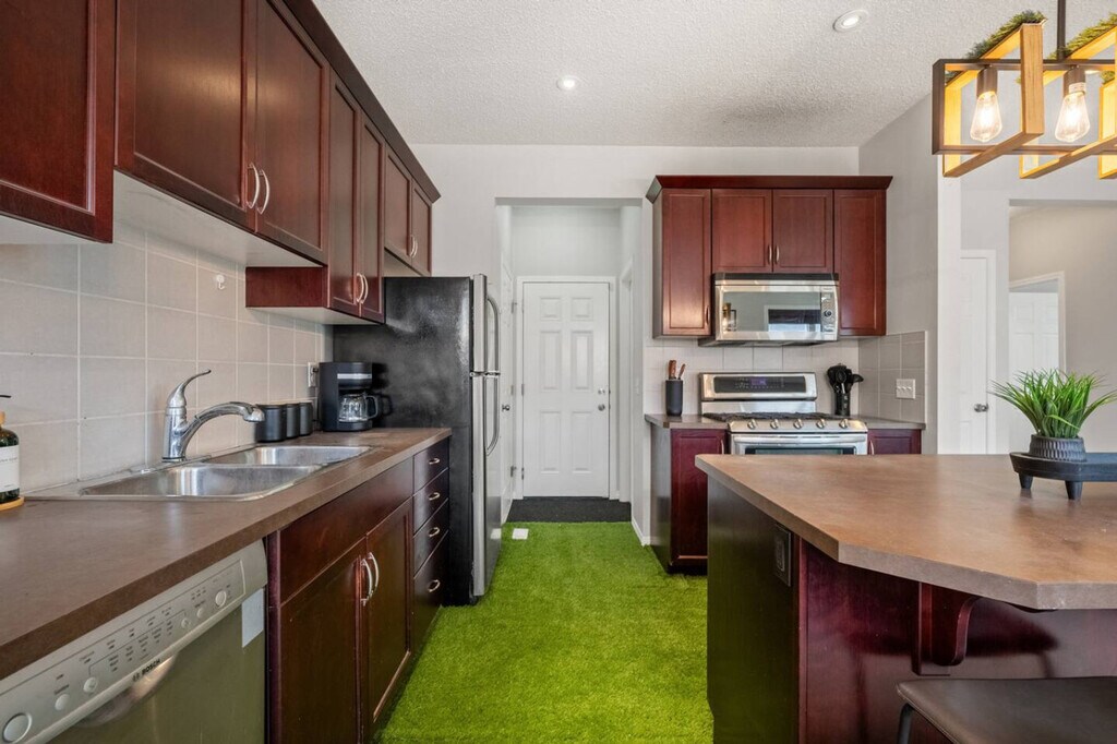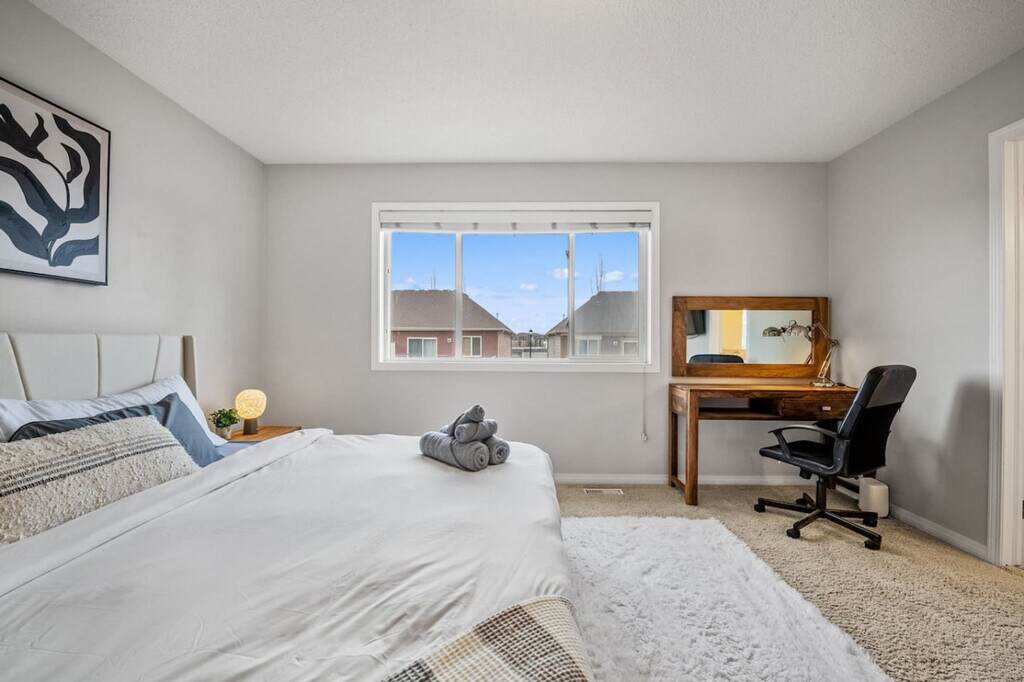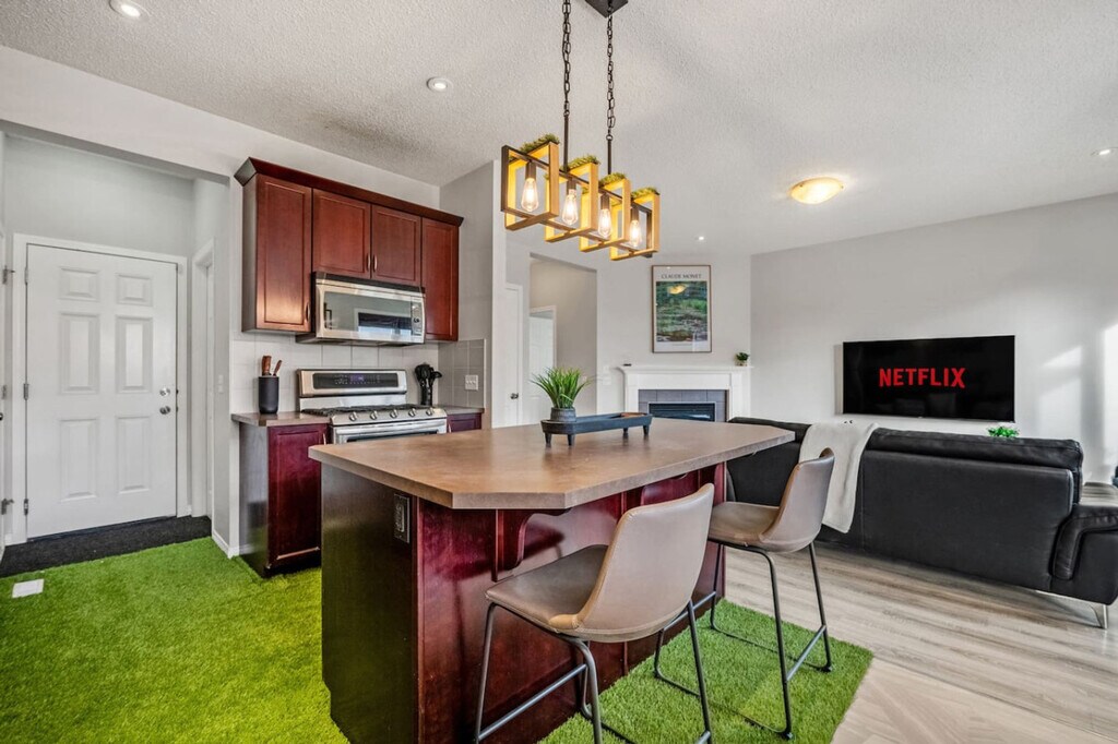 Feel at home in this refined and spacious townhome, designed for both comfort and convenience. This property features a fully equipped kitchen with stainless steel and custom appliances, including a 4-burner stove, oven, microwave, refrigerator, freezer, and dishwasher with pods provided. A coffee maker, toaster, and other essentials are also available. The living room includes a sofa, accent chair, a 65" smart TV with Netflix, and fast Wi-Fi. For sleeping arrangements, premium linens and pillows are provided for all beds. There is also a washer and dryer in the unit with detergent provided. The en-suite tub has a jacuzzi. A crib, pack 'n play, and high chair are available. Optional upgrades include a National Park entry, welcome basket, birthday decor package, romantic wine and flower package, spa at home package, movie night upgrade, Christmas tree and decor, Halloween decor and pumpkin carving package, winter cozy package, beer tasting kit, diffuser and aroma set, additional bedding and sleeping arrangements, grocery pre-stocking service, and a pet-friendly package. One-car garage parking, driveway parking, and street parking are available. Located in a transit-friendly area with convenient access to Airdrie Transit routes, including the Intercity Express (ICE) service for trips to Calgary. The Windridge community offers a growing mix of amenities and pedestrian-friendly streets. Windridge connects to Airdrie’s extensive trail system, including sections of the Trans Canada Trail, perfect for biking, jogging, or leisurely walks. A $250 CAD fine will be charged if smoking occurs with the migration of smoke or smell of smoke from the unit, following law and fine policy. No parties, drugs, excessive drinking, or loud music are allowed. Events for work or meetings are allowed upon request. Quiet hours are from 10 pm to 7 am; please be mindful of neighbors and basement tenants. We have a strict complaint policy: one complaint is a warning, and the second complaint is an eviction. Keep noise under 85db, as we have a noise detector. A simple pre-arrival form, agreement, deposit, and ID verification may be required prior to check-in. Unauthorized late check out will result in an extra night stay or additional fees to apply. [SI]