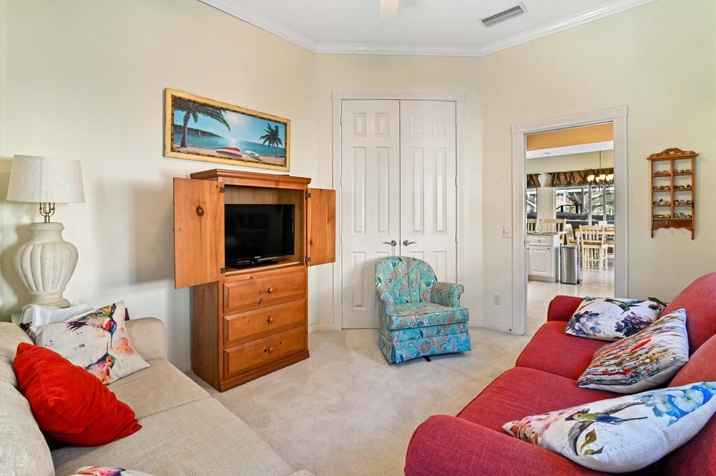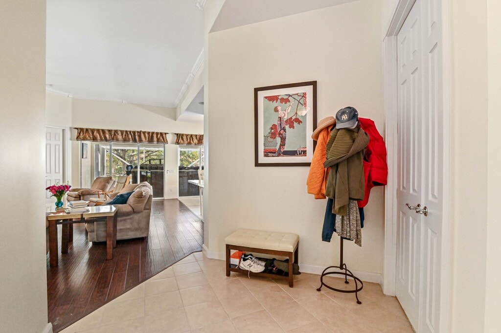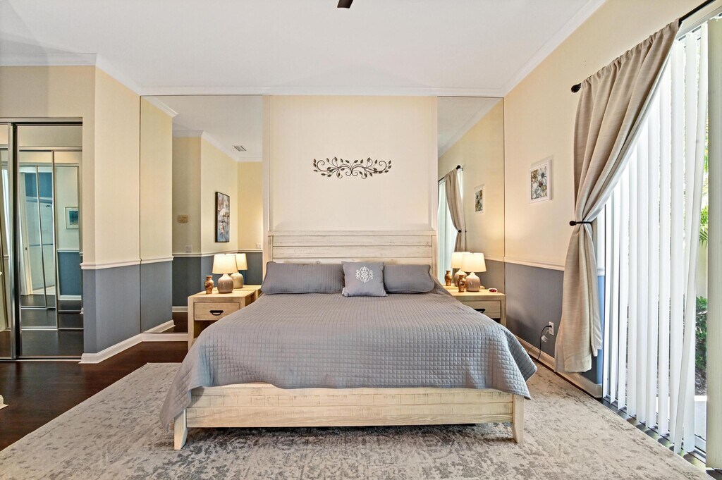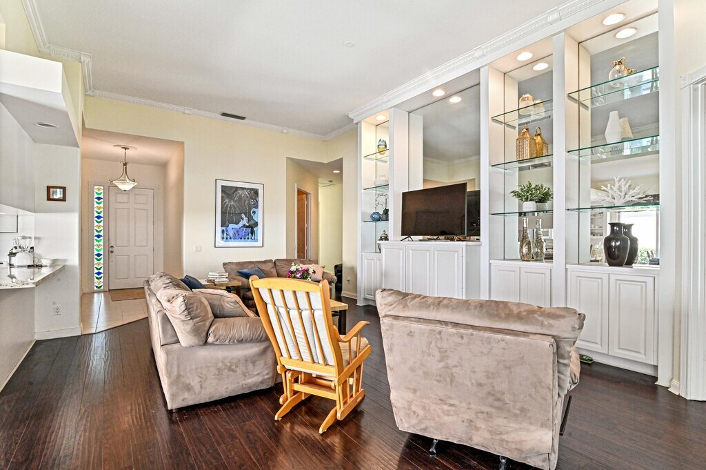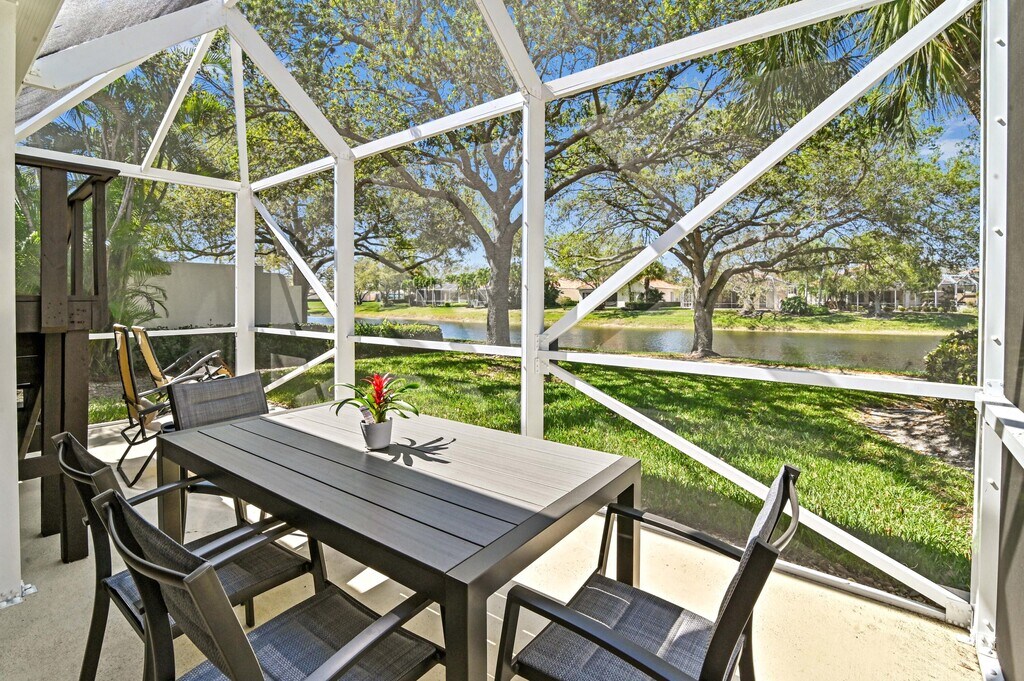 Elegant and spacious home in the exclusive community of Riverwalk. Open concept 2 bedroom 2 bath plus den home with garage for 1 car and complete gym! BBQ Grill, screened-in patio overlooking the lake with a swim spa. Massive master suite with dual sinks and spa tub. High ceilings with crown molding and laundry room inside. Located just minutes from the Turnpike, I-95, Wellington, Boynton Beach, Downtown West Palm Beach, gorgeous area beaches, and 3 international airports.