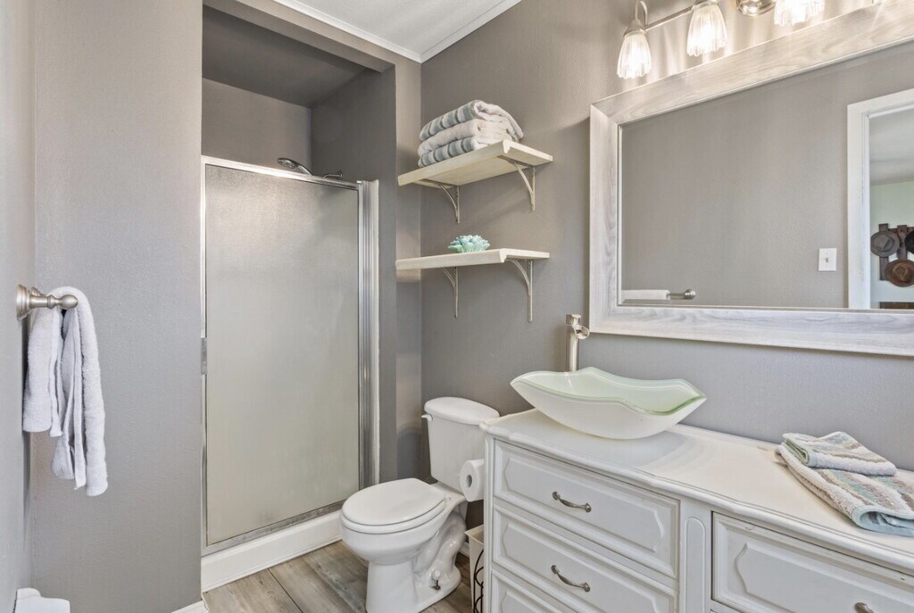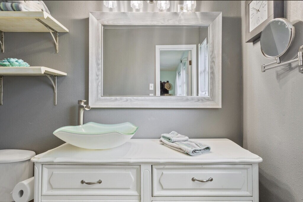 Tucked beneath mature oak trees on a shaded lot in the highly desirable Woodway, this charming brick home on Falcon Drive offers comfort, flexibility, and thoughtful updates throughout. This 3-bedroom, 2-bath home includes a versatile fourth bedroom that can serve as a game room, office, or art studio, complete with its own private entrance. Inside, you’ll find an open layout with updated flooring and a beautifully renovated kitchen featuring stainless steel appliances, a gas range, a built-in glass washer at the sink, and a custom banquette with bench storage for small appliances or seasonal items. A stylish accent wall highlights an additional flex space ideal for a second living area or dining room. Large windows and a new sliding glass door overlook the freshly stained deck, creating seamless indoor-outdoor living. The three main bedrooms and two bathrooms are situated on one side of the home and offer generous closet space. The hall bath has been partially updated with a new vanity, mirror, lighting, and flooring. The primary suite features a spacious closet and a unique en-suite bath with an antique dresser vanity, glass sink, and designer finishes. A spacious laundry room off the kitchen provides room for a freezer or extra storage and includes a secondary exterior door with a dog door for added convenience. The converted garage serves as the fourth bedroom and includes built-ins, a walk-in closet, and private access. Outside, the property offers covered parking for two vehicles, additional concrete parking for a boat or trailer, and an insulated workshop with a bay door, window unit, and 110v electrical service—adding exceptional functionality to this already versatile home.