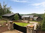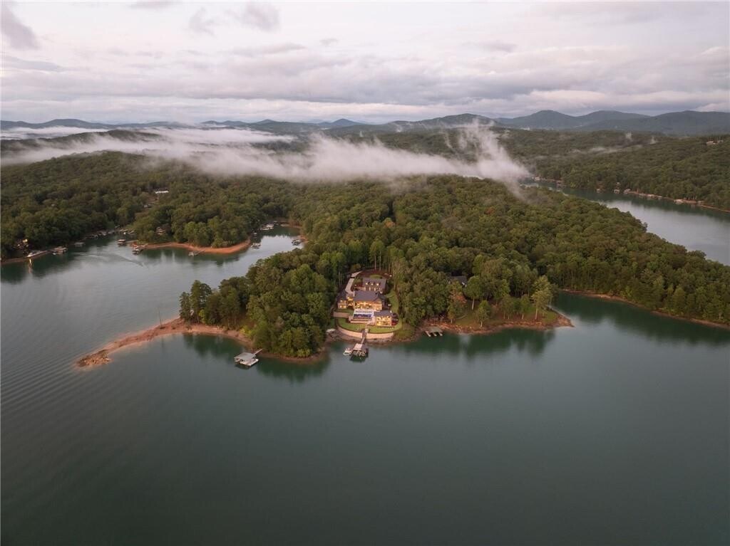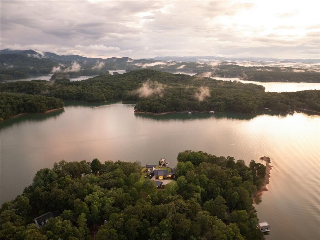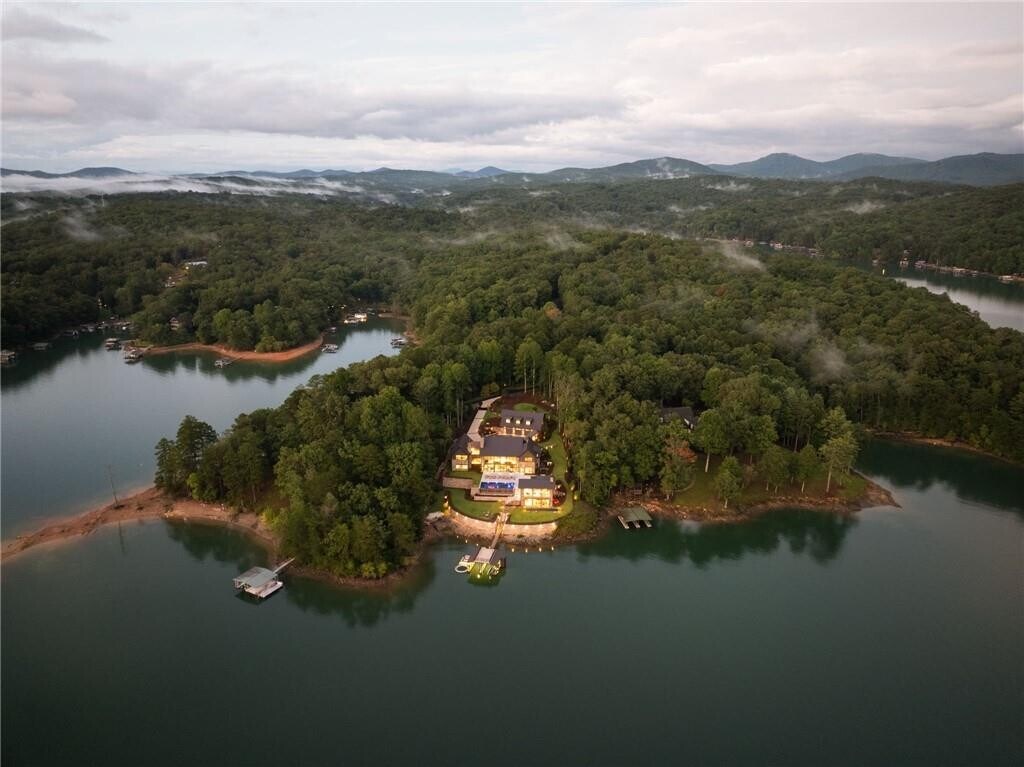 Nestled on the pristine shores of Lake Blue Ridge,this newly constructed modern chalet-style mountain compound represents a rare offering of architectural excellence,privacy,and waterfront luxury. Situated on a private 1.5-acre peninsula,the property commands approximately 270 degrees of uninterrupted lake views,creating a truly immersive water-to-mountain living experience rarely found in North Georgia. Designed as a multi-structure luxury compound,the estate includes a main residence,guest house,and pool house,each newly built and thoughtfully positioned to maximize views,privacy,and seamless indoor–outdoor living. The modern chalet aesthetic blends clean contemporary lines with warm natural materials,perfectly complementing the surrounding Blue Ridge landscape. Accessible via a private road,the property offers exceptional seclusion while maintaining convenient access to the amenities of Blue Ridge. The peninsula setting ensures deep water frontage year-round,culminating in a private two-level dock,ideal for boating,swimming,and lakeside entertaining in all seasons. The expansive grounds provide multiple outdoor living and entertainment areas,enhanced by the pool house (containing its own private gym & spa) and panoramic water vistas from nearly every vantage point,including the impeccable infinity edge pool. A one-of-a-kind Lake Blue Ridge offering,this newly built compound delivers modern mountain luxury at its highest level where architectural sophistication meets the serenity of a private waterfront peninsula. The incredible compound can comfortably host 15+ and is ideal for year-round luxury entertaining & vacationing!! Don't miss out!!