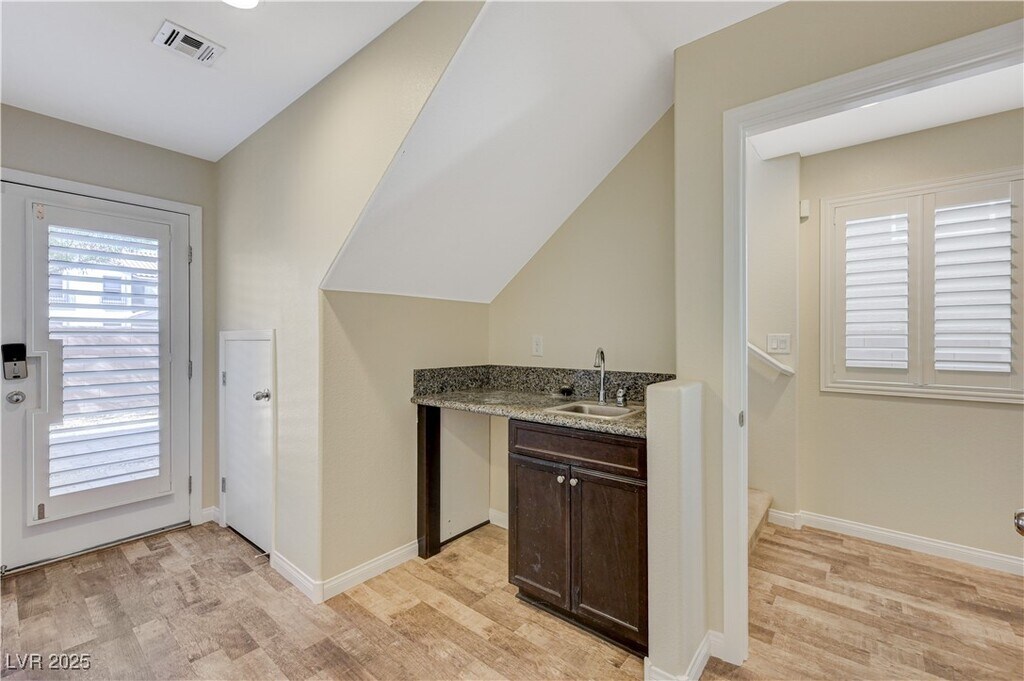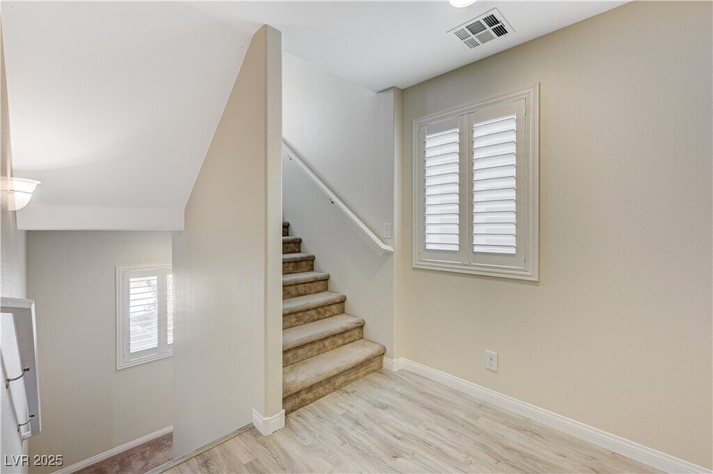Located in the prestigious gated community of Quintessa in Mountains Edge, highly upgraded 4-bedroom, 4-bathroom with attached 2 car garage home offers the perfect blend of modern living and comfort. A standout feature is the rooftop deck, showcasing stunning views of the city, mountains, and the Las Vegas Strip— perfect for entertaining. Stainless steel appliances, a spacious center island, tons of cabinetry, perfect for both daily use and hosting. A first-floor suite provides flexibility for multi-generational living or guest accommodations. Throughout the home, you'll find a stylish mix of luxury vinyl plank, tile, and carpet flooring, along with plantation shutters and ceiling fans in every room. The beautifully landscaped backyard offers a private outdoor retreat designed for entertaining or quiet evenings. Residents enjoy access to community amenities including a pool and clubhouse, all within close proximity to outdoor recreation, top-rated schools, dining, and shopping.
