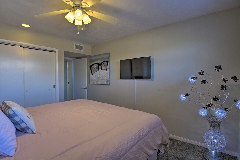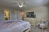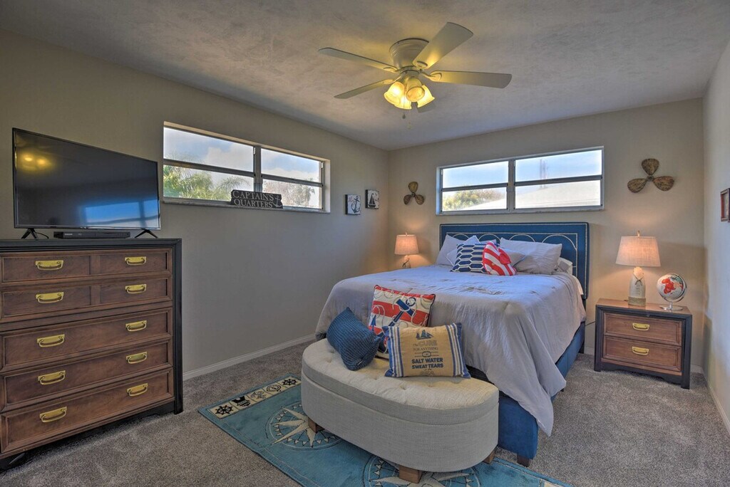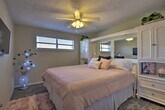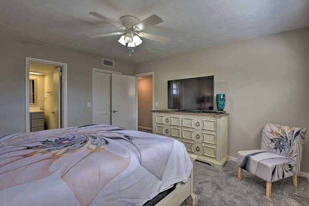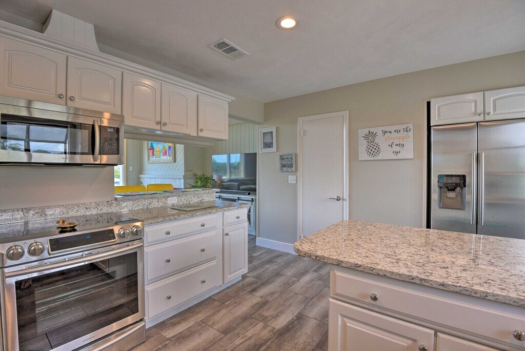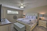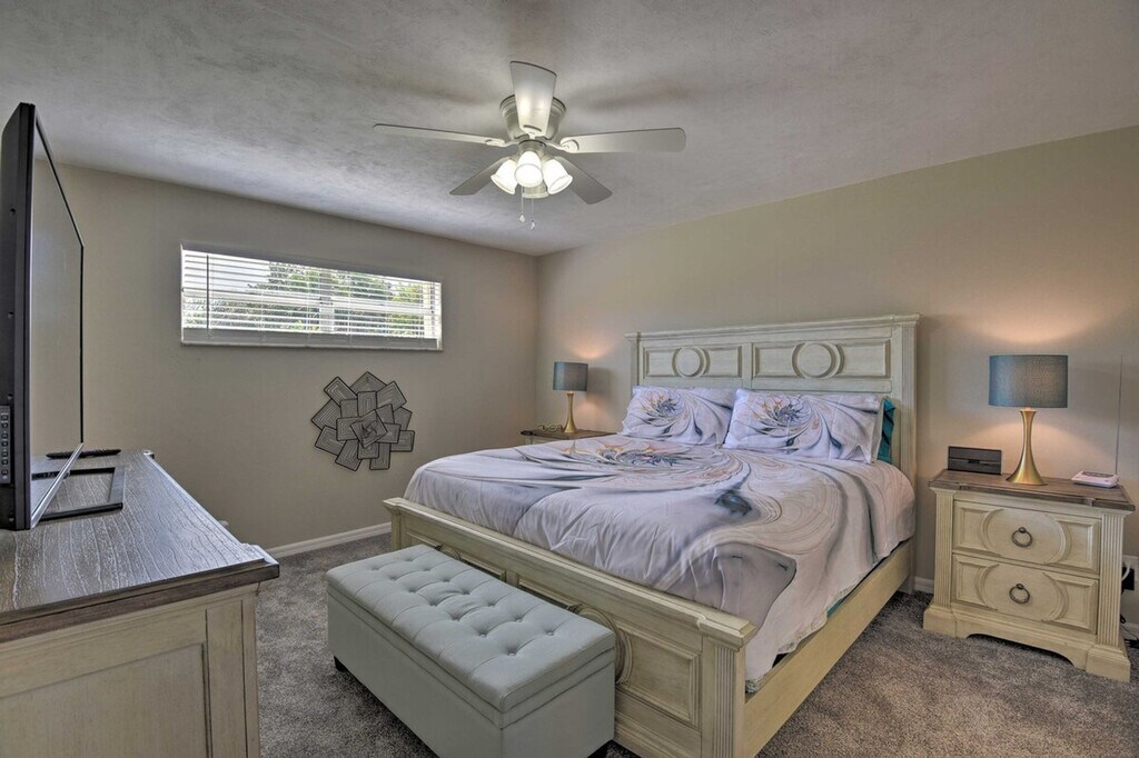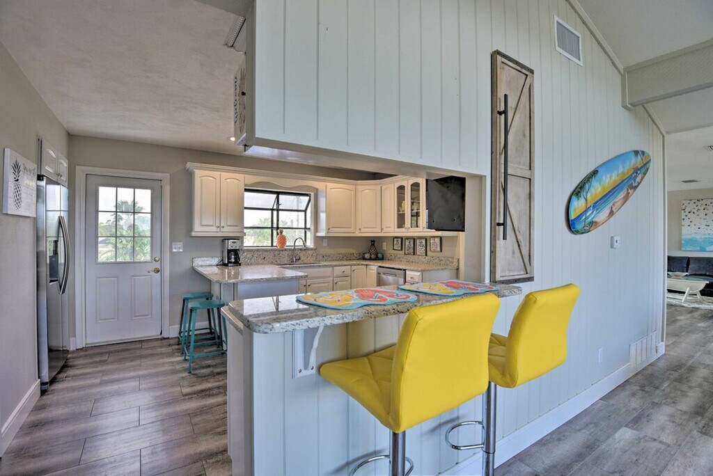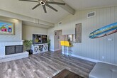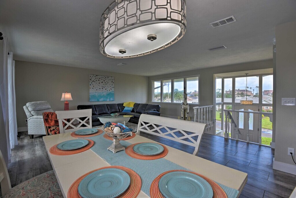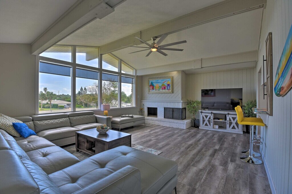 Experience the serene eastern coast of Florida and feel at home in this inviting 4-bedroom, 2.5-bath, 2-story residence nestled just across the street from Ormond Beach. Access to the apartment is only by stairs. Designed with family beach retreats and snowbirds in mind, this 30-day rental offers a stunning modern interior and fantastic outdoor amenities on a spacious plot of land. The private fenced-in yard features a pool, patio, lawn chairs, outdoor dining space, charcoal grill, palm trees, and a picnic table. There is also a Juliet-style balcony. The social room features a dining room, eclectic decor, and leather furniture. The dining room features whitewashed furnishings, beach-themed decor, a leather L-shaped sofa, picture windows, ceiling fans, and a wood-burning fireplace. Entertainment is provided by flat-screen smart TVs with cable. The fully equipped kitchen features stainless steel appliances, granite countertops, 2 breakfast bars, a drip coffee maker, an electric range, a knife set, and a hood vent. Linens, towels, a washer and dryer, central heating, beach chairs, and an umbrella are provided. Driveway parking is available for 2 vehicles, garage parking for 1 vehicle, and street parking. RV and trailer parking are also available. A pack 'N Play is available. This apartment is in a prime location to enjoy everything Ormond Beach has to offer, whether you're here to soak up the sun on the beach, play at the River Bend Golf Club, or visit the Daytona International Speedway. Smoking, pets, events, parties, and large gatherings are not allowed. Guests must be at least 25 years old to book. The property requires stairs and may be difficult for guests with limited mobility. [SI]