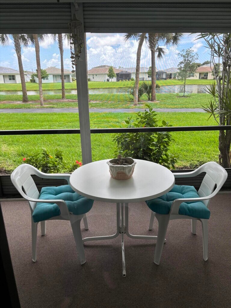 This cozy and larger FURNISHED 1230sq ft 2 bed 2 bath unit is on the ground floor in sought after Huntington Lakes. Sip coffee on the screened in patio out back with a peaceful view of the new lake. There's a garden view in the front and bringing packages in is easy as it's only a few steps to parking as it is right in front of your door! The master has a comfy king-sized bed with a large smart tv and alcove with another sofa for lounging or napping and the den has a sleeper sofa and a smart tv with another full bathroom. Both baths are fully updated! The living room has a sleeper sofa as well. There's an eat-in kitchen and larger dining area as well as a washer/dryer. This 55+ popular community has a wonderful clubhouse with many