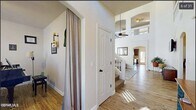 Features include refrigerated air,vaulted ceilings,downstairs office,open family room with large windows,and a spacious kitchen with granite counters,island,and breakfast nook. Primary suite downstairs with walk‑in closet,dual vanities,garden tub,and separate shower. Additional downstairs bedroom and full bath. Upstairs offers a loft with balcony and mountain/valley views,plus two bedrooms and a full bath. Backyard includes a covered patio and lush green lawn.