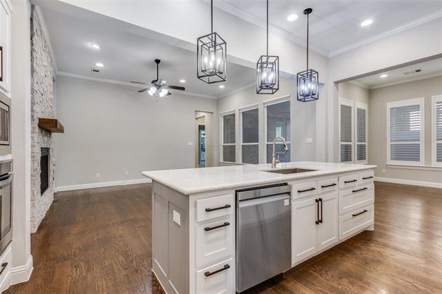 Beautiful single-story on sought-after GREEN BELT lot just minutes to the Craig Ranch TPC golf course and only 10 miles to LEGACY WEST in Frisco ISD! This stylish home with 3 BR, 2.5 bath + study, front porch overlooking green belt, solid hardwood floors except in BRs & wet areas, Plantation shutters. Split BRs, gorgeous island kitchen w 6-burner KitchenAid gas cooktop, quartz countertop, FR w FP w dramatic wall of windows to outdoor covered LA & same view from breakfast area. Planning station desk, utility w cabs.