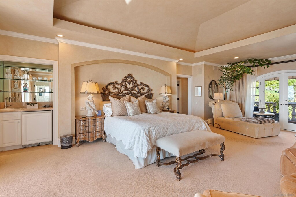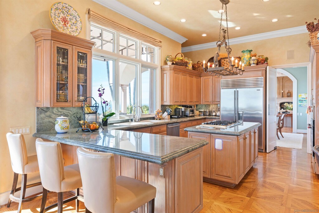 Jetliner 270 degree views that encompass the Pacific Ocean,La Jolla Country Club,Catalina Island and beyond are showcased by this extraordinary Mediterranean Villa. Nestled at the end of a long private driveway on a quiet serene street,this exquisite fully-furnished home boasts privacy and a seamless indoor-outdoor flow. Enter through grand double doors into the foyer,complete with soaring ceilings and picturesque ocean views. The formal living room boasts coffered ceilings,a cozy fireplace,a wet bar and French doors that open to the expansive terrace- the ideal place to entertain on all scales. Awash with natural light throughout,the home offers additional highlights including a formal dining room,cozy family room with vaulted beamed ceilings,and gourmet chef's kitchen featuring top-of-the-line appliances,sleek cabinetry,breakfast area and a spacious island - perfect for culinary enthusiasts. The primary suite rivals the finest resorts,and features a variety of sitting areas,statement fireplace and French doors that open to a private balcony with breathtaking ocean views. Relax and unwind in the dual spa-like en-suite bathrooms,complete with a sumptuous jetted tub,custom walk-in closets,bespoke shoe-room and two home offices - outfitted with sensational wainscoting and custom built-ins. Five additional secondary bedroom suites offer the ultimate privacy for guests. MLS# 250037360