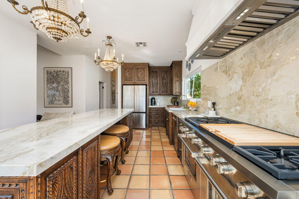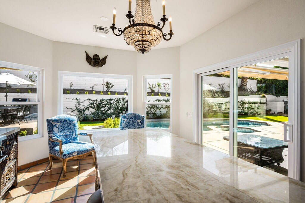 High-End Premium Seasonal Rental - South Palm Desert. Experience the best of the Coachella Valley in this stunning 3-bedroom,2.5-bath solar-powered retreat,tucked away on a quiet cul-de-sac just moments from the world-class dining and shopping of El Paseo. Perfectly situated for guests attending the BNP Paribas Tennis Tournament and Stagecoach Music Festival,this home offers luxury,comfort,and effortless entertaining. Spanning 2,534 square feet,the residence features beautifully furnished French Moroccan-inspired living spaces designed for relaxing and gathering. The chef's kitchen is equipped with premium Wolf and Bosch appliances,custom carved cabinetry,generous prep space,a walk-in pantry,and a formal dining area ideal for hosting. Each bedroom is appointed with hotel-quality bedding and custom closet built-ins,while the spa-inspired primary suite boasts a freestanding soaking tub,oversized open shower with dual showerheads,and striking floor-to-ceiling tile. Expansive windows frame breathtaking mountain views and manicured grounds throughout. Step outside to your private backyard oasis,complete with a built-in pool and spa,multiple lounge areas,and automated shades--perfect for unwinding after a day at the tennis courts or dancing under the desert sky. Monthly rent includes weekly pool and gardening service,biweekly housekeeping,a three-car garage with Tesla charger,64-bottle wine fridge,and a $350 monthly utility credit. Your desert escape awaits. Rental Conditions: 30 day minimal rental duration. *Seasonal (Nov. 15 - April 31) listed for $17,000. *Off-Season (May 1- Nov. 14) listed for $9,250. * Pool & Spa heating available upon request. Small to Medium Dog Permitted upon Specific Approval of Landlord. * $400 move-out clean paid by tenant. * Tenant must complete a rent-spree credit,criminal background screening application MLS # 219143881