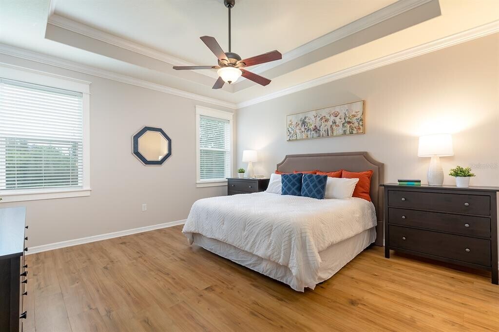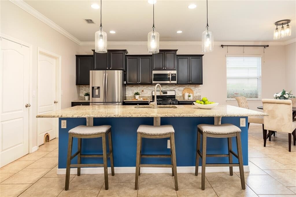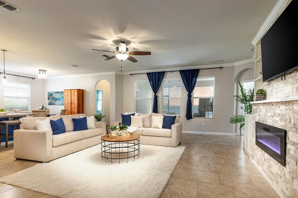 Welcome to 731 Evening Star Lane—a cul-de-sac retreat in one of Deland’s most desirable resort-style communities. This beautifully appointed 4-bedroom,3-bathroom,3-car garage home has high ceilings,decorative wainscoting,and crown molding accents,giving a warm and luxurious feel. The open-concept layout flows seamlessly from the foyer into the spacious great room,where a custom entertainment wall featuring stacked stone and an electric fireplace creates a stunning focal point. Imagine cozy nights in front of the glowing fireplace! The chef’s kitchen is a showstopper,featuring rich espresso cabinetry,stainless steel appliances,a gas stove,and a HUGE granite island perfect for casual dining or having a sprawling spread of snacks for family game night. A three way split bedroom layout offers privacy and versatility—ideal for families,guests,or a home office. Your primary suite is a peaceful sanctuary with a tray ceiling,a spa-inspired ensuite bath,dual vanities,a tiled shower,and a garden soaking tub designed for deep relaxation. Step out to the screened lanai,where you can enjoy Florida’s breezy evenings overlooking your fenced backyard—perfect for family fun,pets,or a quiet morning coffee. The rent includes CABLE TV,HIGH-SPEED INTERNET,and IRRIGATION WATER,and access to resort-style pools,clubhouses,fitness center,tennis and pickleball courts,playgrounds,and a vibrant calendar of social activities. Just minutes from award-winning downtown Deland,you can savor local restaurants,charming shops,and community events. A QUICK drive to I-4 makes commuting a breeze. We look forward to seeing you for a visit soon! MLS# O6382969