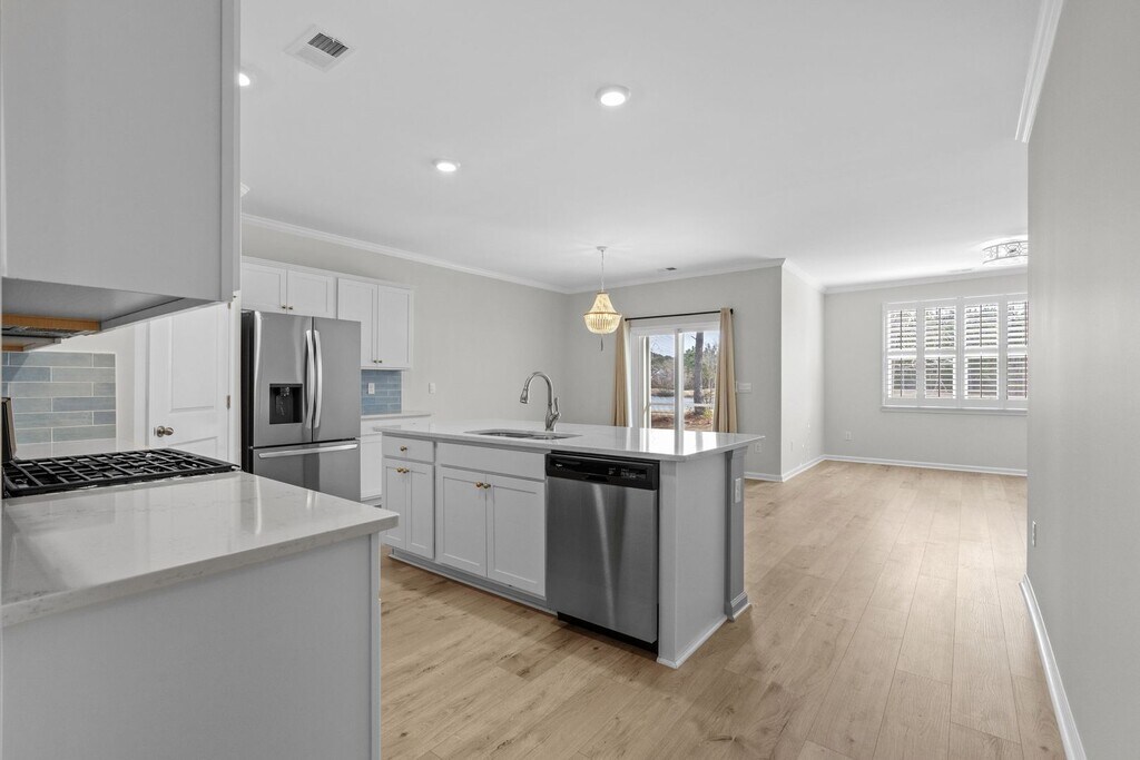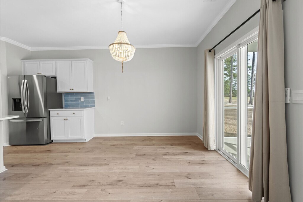 Positioned on an unprecedented lot featuring panoramic views of the water and golf course, this four-bedroom, two-bath home offers a unique blend of luxury and tranquility! The home's interior is also a remarkable sight! When stepping inside, you are greeted with wide-plank flooring, board-and-batten trim molding, beach-boho light fixtures, crown molding, and beautifully selected, welcoming paint colors! The kitchen is a masterpiece of modern design, boasting a porcelain backsplash, quartz countertops, and brushed gold hardware. An organized pantry, laundry room, and primary bathroom, all enhanced with extra custom cabinetry, ensure ample storage. The primary bathroom is a sanctuary of innovation, featuring touchscreen mirrors with anti-fog capabilities and adjustable lighting! Outside, you can enjoy an extended patio perfect for entertaining and a screened-in porch to enjoy inclement weather! You can transfer the equipped ADT monitor to your name for personal use and additional security! Don't let this exceptional home slip through your fingers! Schedule a private showing today and make it yours!