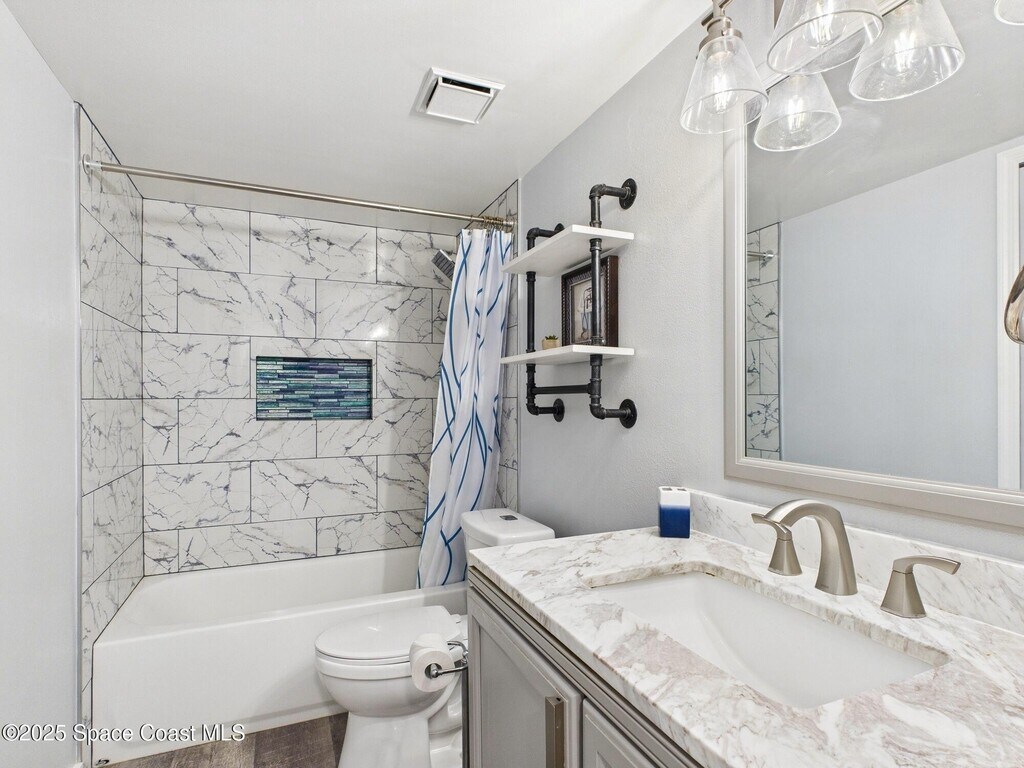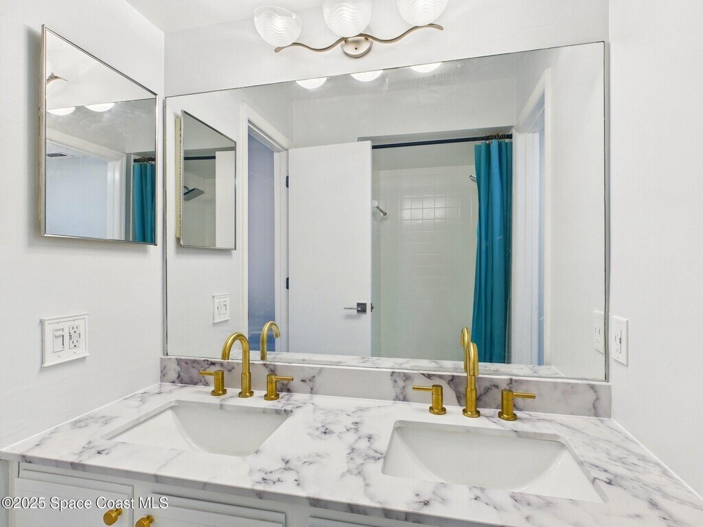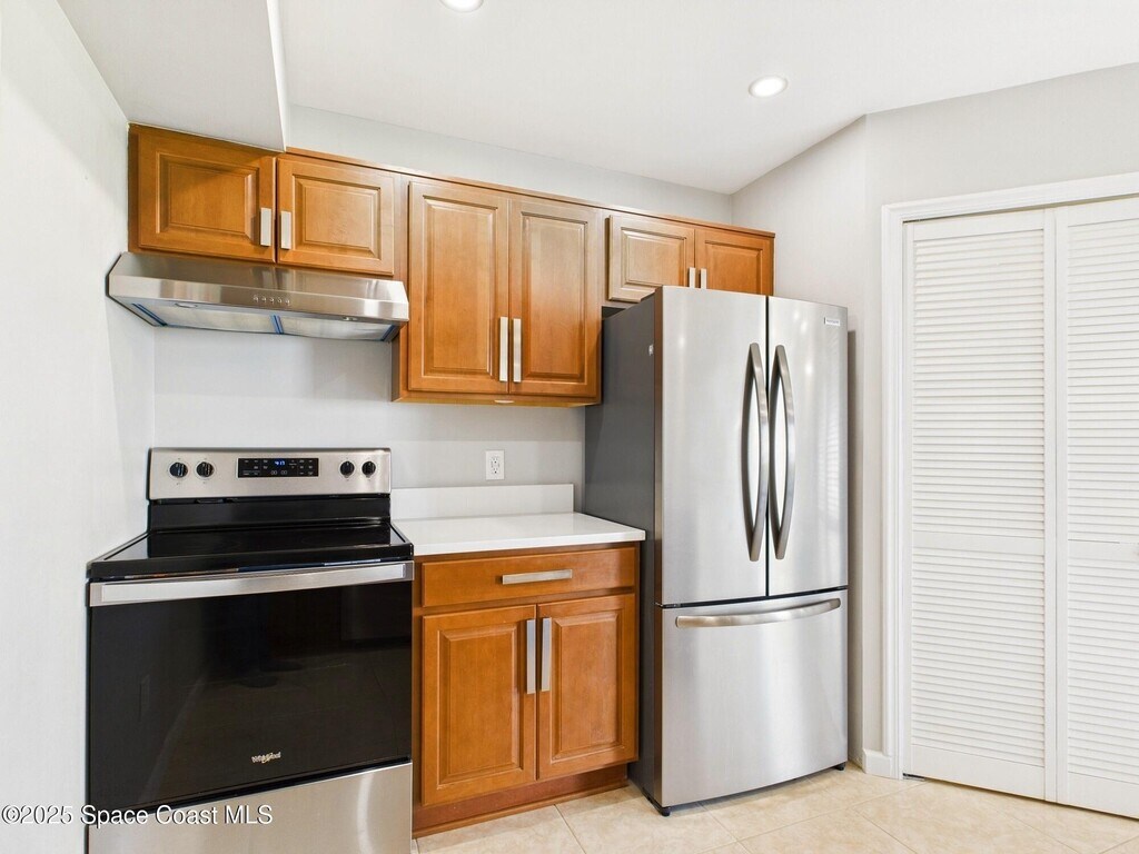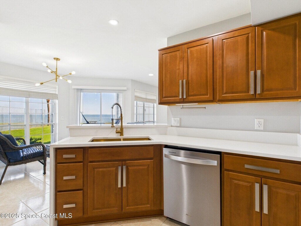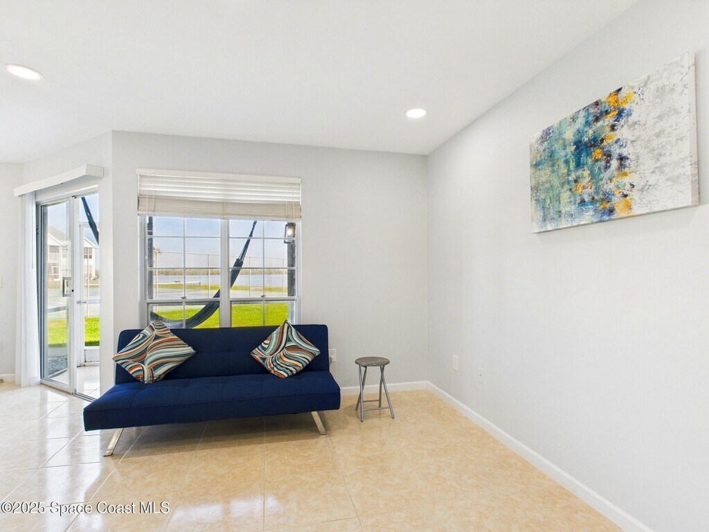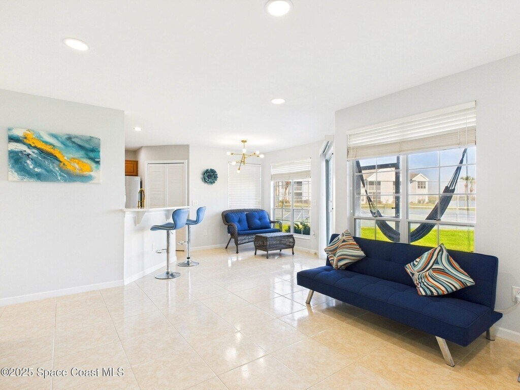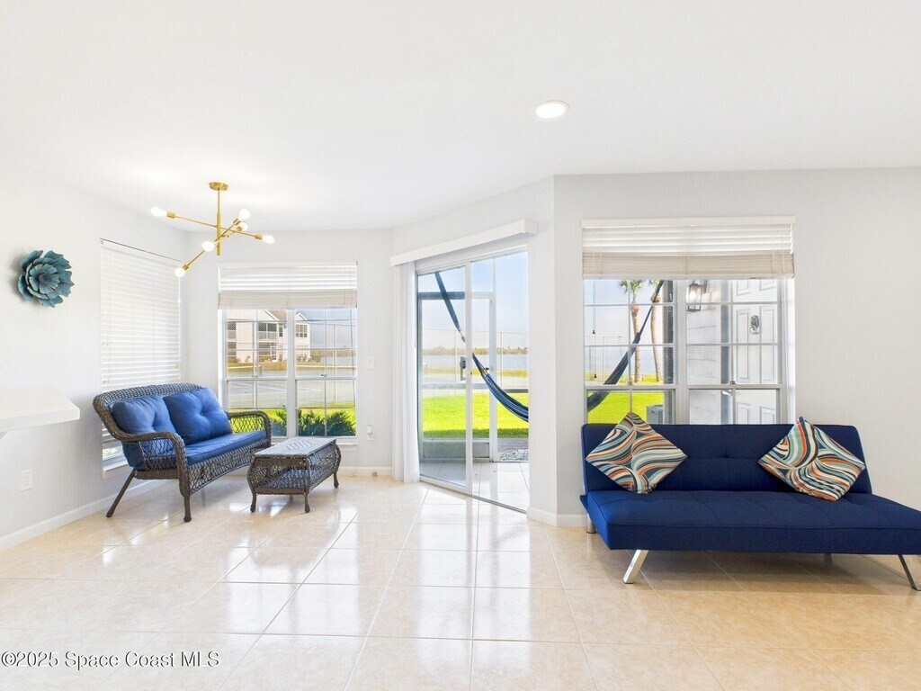 Don't miss this highly sought-after first-floor condo featuring 2 spacious bedrooms and 2 full baths with stunning views of the Intracoastal. Relax on your personal lanai hammock while watching rocket launches and spotting dolphins,manatees and sea birds. The updated kitchen boasts elegant gold accents,soft-close cabinets,recessed lighting,and premium stainless steel appliances. The quartz countertops with waterfall edge & bar-top add a touch of luxury. You'll love the brand-new champagne-colored,high-efficiency washer and steam dryer. The home features a large screen TV,Nest Thermostat,keypad entry,and Ring doorbell for added convenience and security. The HOA includes cable,internet,and access to both waterfront cabanas,heated pools,hot tubs and saunas. Enjoy energy-efficient living with low utility costs,LED recessed lighting on dimmer switches,and beautiful luxury plank tile flooring. Remodeled bathrooms feature sleek tile,solid surface counters,and stylish fixtures