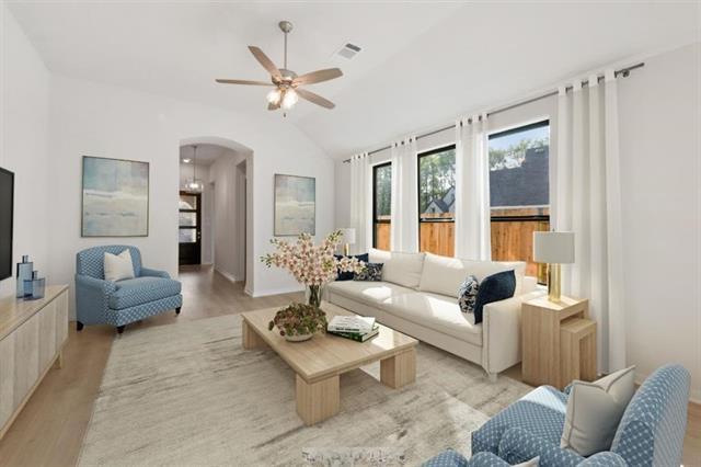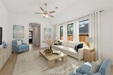 This 2024-built single-story home features four bedrooms and three bathrooms with an open layout and 11-foot ceilings. Large windows throughout the home bring in abundant natural light, and the master bedroom includes a bay window for added brightness. The primary suite offers dual sinks, a walk-in shower, and a spacious walk-in closet. A private fenced backyard with a covered patio and a two-car garage completes the home. Refrigerator, washer, dryer, and other essential appliances are included. Located in the Highlands community, residents have access to a resort-style pool with a lazy river, pickleball courts, walking paths, and nearby Highland Pines Golf Course. The home is within the attendance zone of the brand-new Highlands Elementary School. Convenient access to US-59 and SH-99 connects the neighborhood to shopping, dining, and surrounding areas.