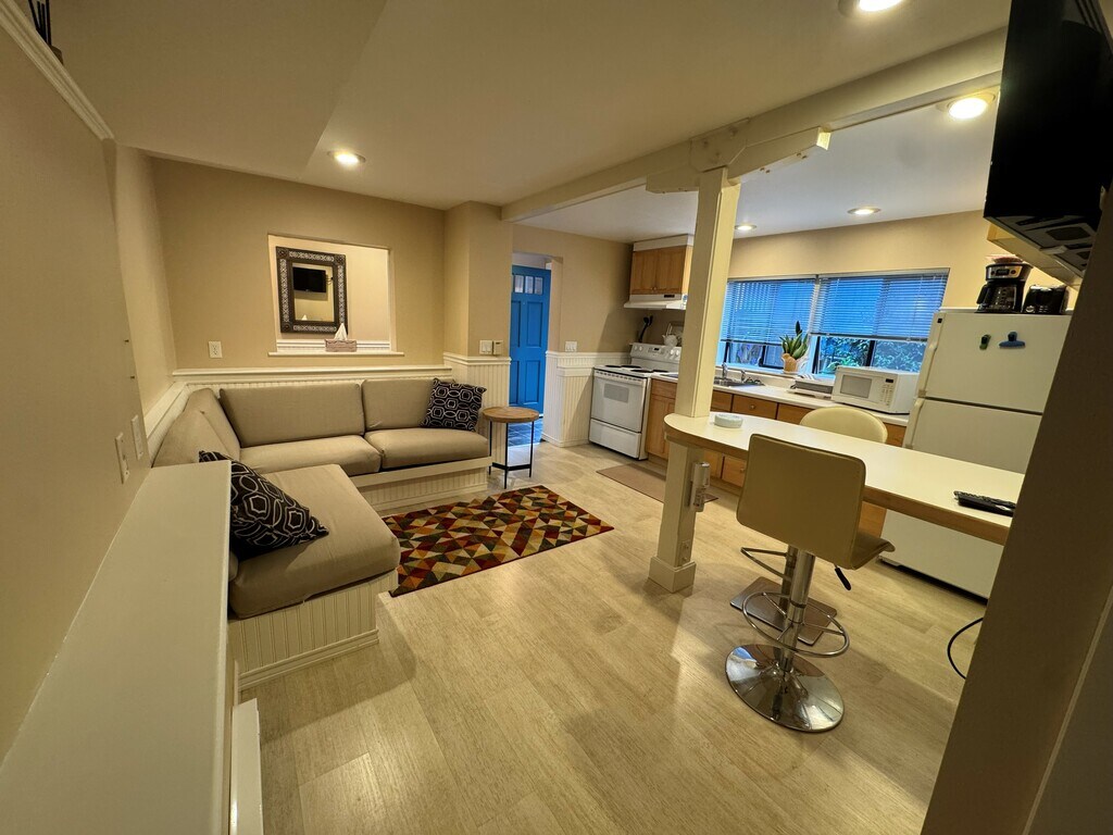 Furnished 1-Bedroom Daylight Basement Unit Northeast Seattle (Ravenna/Roosevelt) Looking for a responsible, quiet, and tidy tenant to rent this cozy, fully furnished one-bedroom daylight basement unit with a private entrance in a quiet Northeast Seattle neighborhood. ?This space is perfect for a student or a traveling professional here on contract (such as a healthcare worker). Open to 3, 6 or 9-month lease. Less than 15 min walk to Roosevelt Light Rail station. Less than 3 miles bike or drive to UW Hospital or Seattle Children's Hospital. Ample free street parking available. Multiple grocery stores within walking distance.What's Included: Fully furnished and move-in ready Private entrance and private bathroom Queen bed, closet &; bedding Small TV Oven, stove, coffee maker, microwave &; full-size fridge Dishware, utensils &; cookware Wi-Fi and all utilities included Private washer/dryer Free street parking