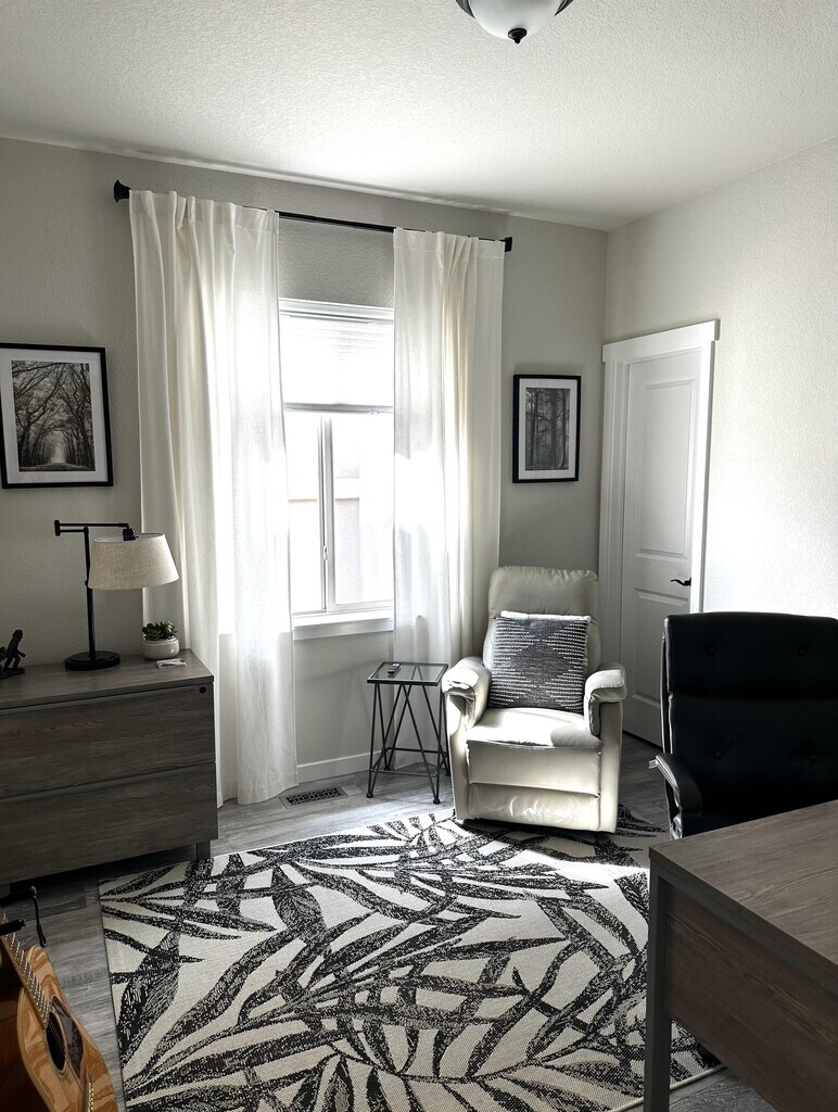 FULLY FURNISHED HOME Beautiful 2 Bedroom with Office fully furnished Short term Rental 6 to 9 month lease available Nestled in the picturesque pines of Sanctuary Pointe, this fully furnished 1500 square foot home offers a scenic and peaceful retreat just 40 minutes south of Denver and 20 minutes from downtown Colorado Springs. Surrounded by hiking trails and within walking distance of Fox Run Park, the community boasts tranquility and outdoor allure. The interior features a dramatic kitchen with granite countertops that overlook a spacious living area adorned with a cozy fireplace and tv over the mantle. Kitchen is fully equipped with pots, pans, dishes, glassware, and silverware. The roomy master bedroom suite offers a luxurious glass-wall shower and a generous closet. Next to kitchen is a laundry room with full size washer and dryer. On the opposite end of the home, an office space awaits, complete with a desk and wall-mounted tv, and an additional bedroom furnished with twin bed, a reading chair, and a desk.