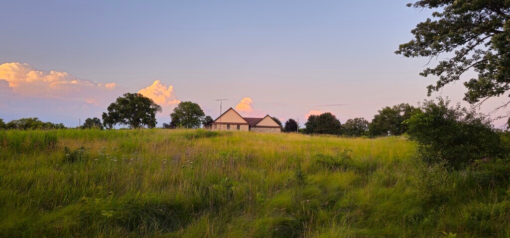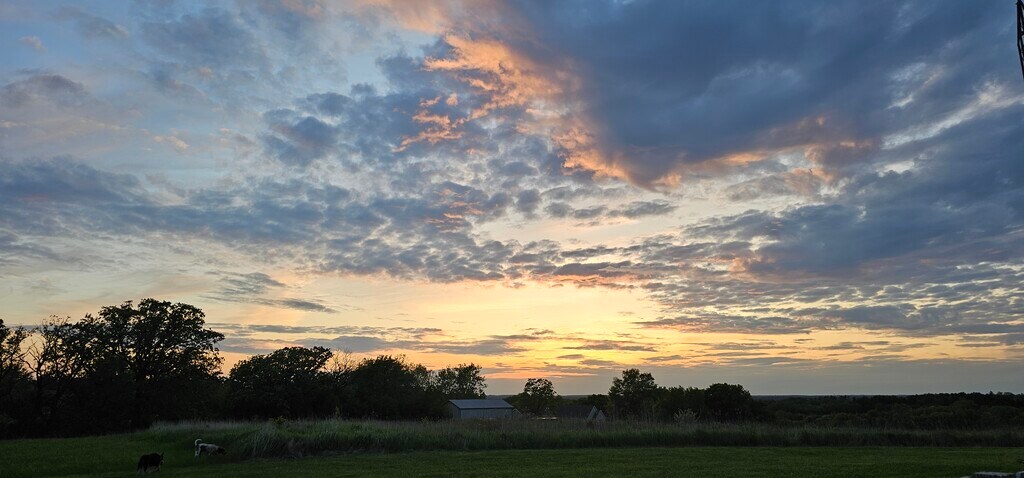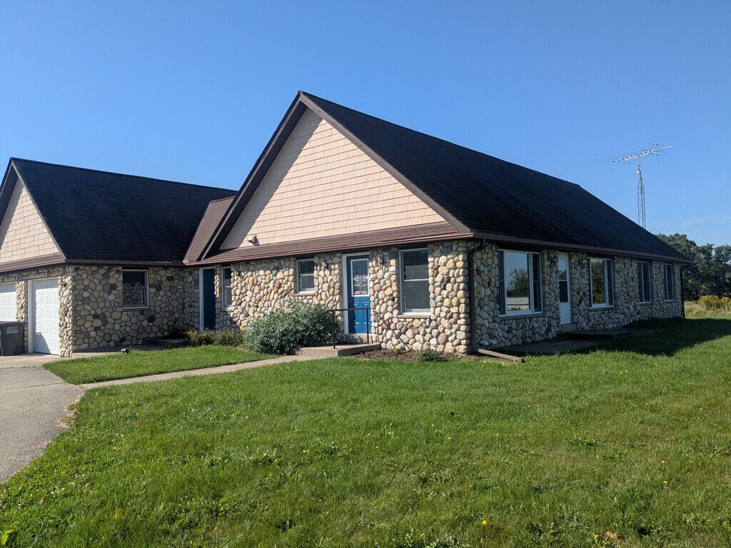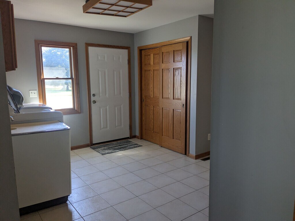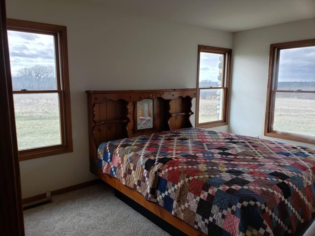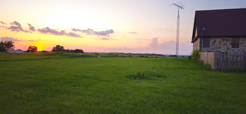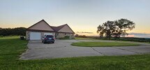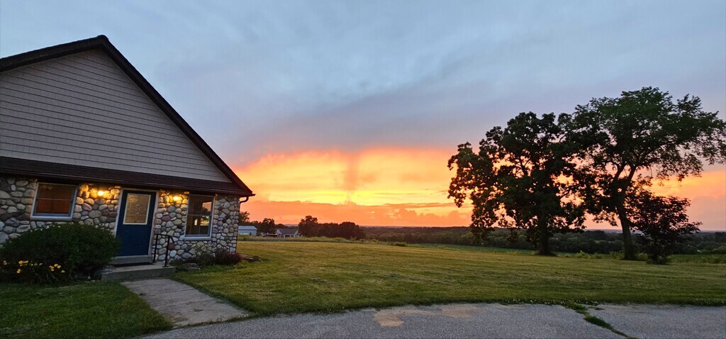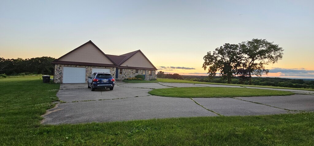 Beautiful quiet 5 acre rural country home on a hill, with amazing view of the sunset and surrounding valley and fields. Only 0.5 miles from I43, this home is perfect for a quick commute. This ranch home was custom built in the year 2000 for entertaining, with a large open kitchen and living room featuring large windows and sliding glass door. A full sized unfinished basement is the perfect space for kids to skate, play pool, play table tennis, and more in winter. There is a fenced area around a covered deck outside the sliding glass doors. This house features stone siding, keeping the heating and cooling bills low. The main bathroom features an oversized whirlpool tub and shower combo, and 7' counter double sinks. The second full bathroom is located near the utility room, making for easy cleanup after tending your garden or hobby farm. The rear has been used for a small sweetcorn field a few years ago, but also has potential for gardens or chickens and other farm projects. Currently it is natural with wildflowers. The oversize garage has 3 overhead doors, including one leading to a basement ramp. This home is in the award winning East Troy school district. It is only a few miles from Alpine Valley ski & music resort. Appliances and trash services are included. Tenant is responsible for electric, propane, snow removal and yard card. House pets are negotiable. Lease terms negotiable. We recommend visiting at sunset.