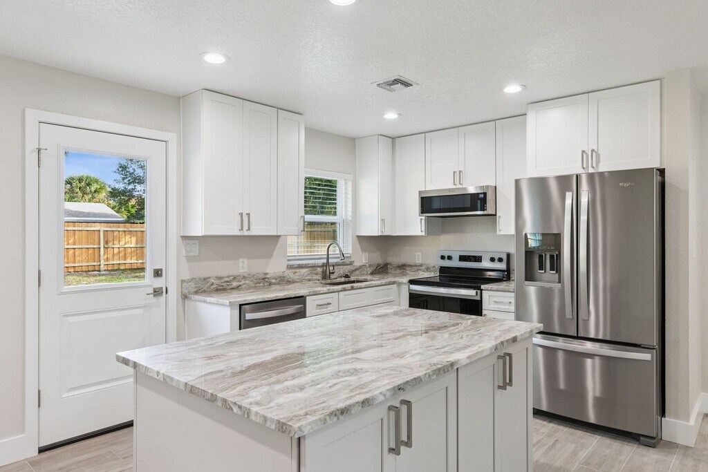 Welcome Home to Effortless Comfort in Winter Park. Step inside this beautifully remodeled 3-bedroom, 2-bath home and feel an immediate sense of calm. Sunlight pours through wide windows, illuminating an airy open-concept design where soft neutral tones meet sleek modern finishes. Every inch has been touched with care, from the brand-new roof above to the elegant tile floors underfoot, inviting you to settle in, unwind, and simply live. The kitchen shines as the centerpiece, blending functionality and style with its marble-patterned countertops, stainless steel Whirlpool appliances, and generous island that doubles as a prep space or casual dining bar. The open flow into the living and dining area creates the perfect backdrop for morning coffee or easy evenings with friends. Each bedroom feels bright and serene, offering clean lines, new windows, and fresh paint that enhances the sense of space. The bathrooms gleam with contemporary subway tile, brushed nickel fixtures, and crisp, modern vanities, bringing spa-like refreshment to everyday routines. A large indoor laundry room, complete with front-load washer and dryer, adds convenience and efficiency, while the attached one-car garage provides secure parking and extra storage. Step outside to your own private retreat: a massive, fully fenced backyard with a brand-new wooden perimeter, ideal for pets, playtime, or lazy afternoons under Florida’s sunshine. Nestled in a peaceful Winter Park neighborhood, this home places you minutes from charming cafés, shopping, and commuter routes, close enough to everything yet tucked away for quiet evenings. With brand-new plumbing, electrical, appliances, flooring, baths, paint, and roof, this home offers the peace of mind of a new build with the warmth of a move-in-ready residence.