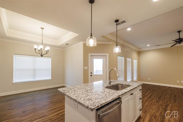 Open floor plan, like new 3 bedroom 2 bath home, with granite countertop, kitchen island, Refrigerator, vinyl flooring in main living areas, and carpet in bedrooms. Covered patio and sprinklers in the yard. professional photos to come, move in in mid-November. The Resident Benefits package required $50 monthly includes renters insurance, 90-day air filters, and much more
