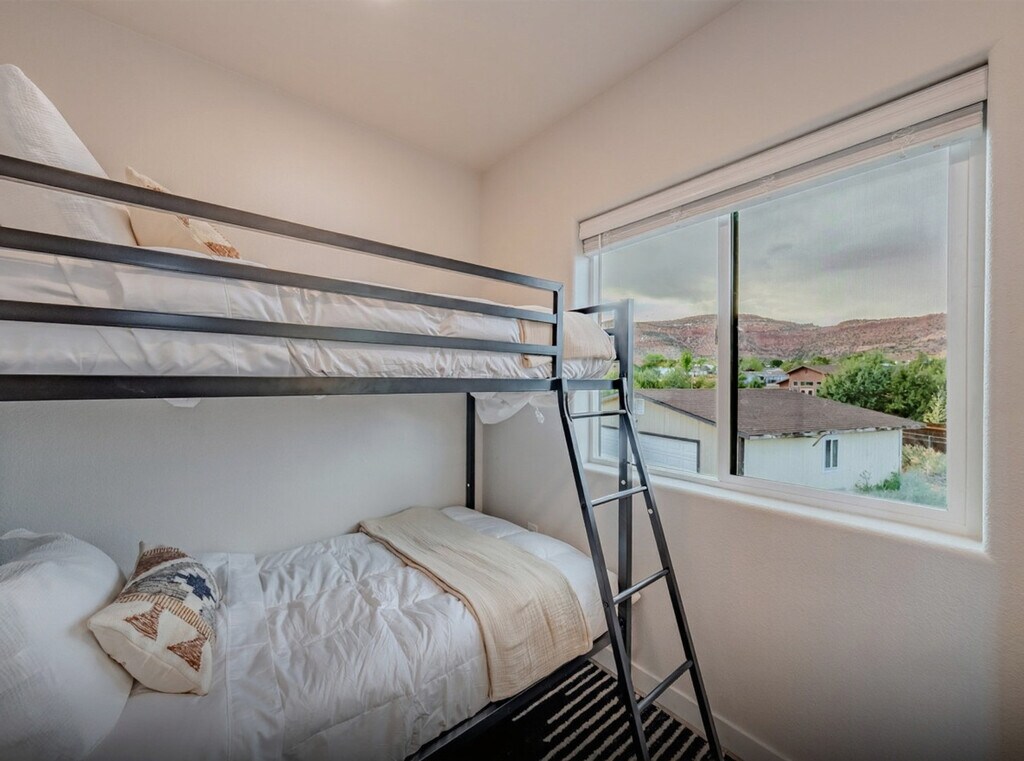 Feel at home in this unique 3-bedroom, 2.5-bath home, perfect for families or groups, offering comfort, convenience, and outdoor charm just minutes from downtown Kanab. The home comfortably sleeps up to 6 guests with a king-size bed, a queen bed, and a bunk bed with two twin beds. Enjoy the fully equipped kitchen, Wi-Fi, Roku TV, and in-unit washer/dryer. The property features a private driveway with space for 4 to 5 cars and additional street parking is available. The main floor boasts a master bedroom with an en-suite bathroom, a half bathroom with laundry facilities, a fully equipped kitchen, and a comfortable living room. Upstairs, you'll find a queen bedroom, a full bathroom, a kids' bedroom with a bunk bed, a sitting area, and a balcony. The backyard is a delightful retreat with a pergola featuring a hammock and swings, a fire pit for cozy evenings, and a cornhole game area. The property includes an EV charger for your convenience. Pets are welcome at a cost of $10 per pet, per day. Guests are required to pick up after their pets, and additional charges may apply for any damages caused by pets. Unauthorized pets will incur a $250 fee. Nestled in a quiet residential area of Kanab, this home offers a peaceful retreat while still being close to the action. Kanab is a small, walkable town, but having a vehicle is recommended for exploring local sights and national parks. On-site parking is available, and the streets are safe and easy to navigate. While the neighborhood is friendly, guests are kindly asked to observe quiet hours after 10 PM. A $200 per day fee will be assessed for smoking or vaping on the premises. Early check-in and late check-out requests are subject to availability and may incur additional fees. Please be aware of the amazing desert dust that may be present during your stay. Our guest services team is available to assist you from 8:00 AM to 10:00 PM MDT, with communication options available outside these hours if needed. [SI]