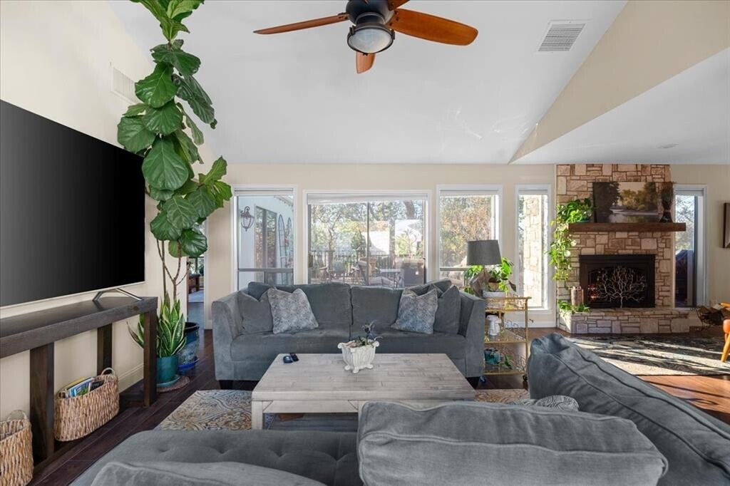 Set inside the loop on sought-after Summerwood Drive, this single-level residence offers a prime New Braunfels location with Guadalupe River access and quick proximity to shopping, dining, and entertainment. Filled with natural light, the open-concept layout features two comfortable living areas and a fireplace, creating an inviting and functional flow for everyday living. A wall of windows frames mature trees and opens to a spacious backyard deck—ideal for morning coffee or relaxed outdoor time. The remodeled kitchen provides generous prep space and a casual dining nook and comes fully equipped with all appliances, including a refrigerator, high-end double built-in oven with vent hood, built-in microwave, dishwasher, washer, and dryer. Spanish Mediterranean tile accents add warmth and character throughout. Secondary bedrooms offer flexibility for guests, a home office, or hobbies, while the oversized garage provides ample storage in addition to parking. Additional highlights include a long extended driveway, greenbelt backdrop, waterfront access, and the ease of single-story living. This is a quiet, private sanctuary with authentic character that is hard to find. The property offers an established neighborhood feel with no enclosed yard aside from the deck area. Pets are allowed. Lease term is negotiable. Home is vacant. Please text or call the listing agent prior to showing and then go; Supra is located at the front door. Tenants agent must be present for all showings. Property is available for lease and for purchase.
