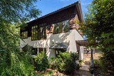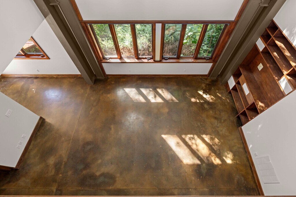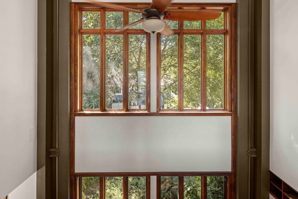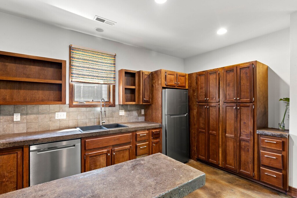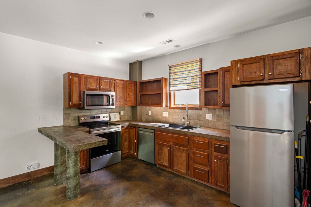 Charming urban oasis less than a mile from West Asheville’s thriving historic business district. Inviting modern interior and outstanding energy efficiency - LEED Silver Certified! The two-story south-facing windows are a showpiece of the home, allowing beautiful natural light and passive solar function. Stained concrete floors throughout the main floor are attractive and functional, retaining warmth from the winter sun and cool underfoot in the summer. Built-in, recessed shelves in the living room are set up for entertainment tech. The open kitchen and dining area feature rich-toned cabinetry and concrete counters. Newer dishwasher (less than a year old); other kitchen appliances are NEW, including the refrigerator, microwave, and electric range with air-frying capability. The main-level primary bedroom includes two closets, and its en suite bathroom has a two-sink vanity and a tiled, walk-in shower. Other main floor spaces include the covered entry porch, foyer with coat closets, the half bathroom, and the laundry closet with stacked washer and dryer included. Tile floors are throughout the upper level, including a full bathroom with a combination shower/ bathtub and two generously-sized bedrooms with pitched ceilings and ceiling fans. The large landing between the bedrooms is open with the great room below, a perfect spot for a sunny sitting area or house plant nursery. The outdoor space is wonderful! Privacy fencing encloses most of the .2 acre lot and lush garden. Stone steps lead to a large pea gravel patio, a spacious platform constructed from Trex decking, the shed available for tenant use, and a fire pit with boulder seating. Thriving plantings and shade trees abound. Located in a sweet historic neighborhood with a community garden just up the street. Off-street parking for two cars. Solar panels with electric backup supply hot water. Rain water collection system. Tenant responsible for lawn care and all utilities including electricity and water/sewer. No smoking. No cosigners. One pet under 30 lb is negotiable.