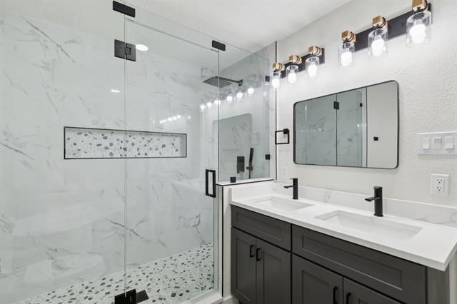 Impeccable Single-Story Home on 1.21 Acres in Rockwall! Nestled among mature trees, this beautifully maintained home sits on a spacious 1.21-acre lot and offers the perfect blend of comfort and style. Step inside to an expansive living room featuring a stunning floor-to-ceiling brick fireplace and double windows that provide picturesque views of the serene backyard. A second living room also boasts a floor-to-ceiling brick fireplace—ideal for cozy evenings or entertaining guests. Plank hardwood floors flow seamlessly through the main living areas, enhancing the home's warm and inviting atmosphere. The amazing kitchen showcases two-tone cabinetry with gray lowers and crisp white uppers, complemented by brand-new 2025 stainless steel appliances including an electric cooktop, built-in oven, and microwave. Enjoy casual meals in the sunny breakfast nook or host gatherings in the large formal dining room, complete with sliding glass doors that open to the expansive backyard patio—perfect for outdoor dining and summer BBQs. The generously sized primary suite features plush carpeting, private doors that open directly to the backyard space, and a spa-inspired en-suite bath with a standalone soaking tub, separate shower with gorgeous stone surround, and dual vanities. This home also offers three spacious guest bedrooms and two beautifully updated guest bathrooms, providing plenty of room for family and visitors. Additional highlights include a large utility room with space for a workstation or pantry and an oversized garage. Outside, the huge grassy yard offers plenty of room to play, garden, or even add a future pool. This property is a rare find—don’t miss your chance to call it home!