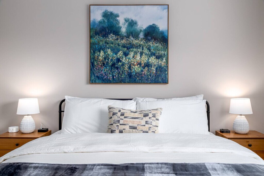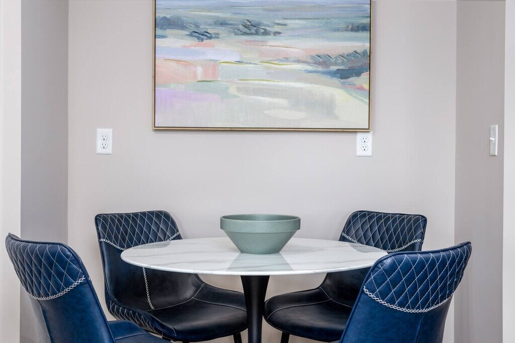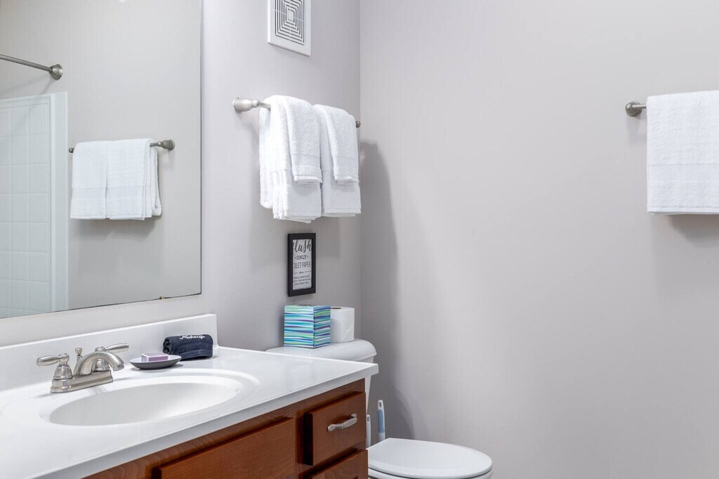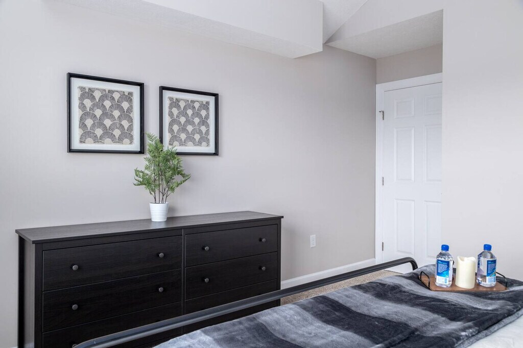 If you're looking for a temporary home that's actually comfortable, this is it! Designed for monthly stays, this top-floor apartment offers stunning water views and features a king-size bed with a 5-star Winkbeds mattress and Frette linens. Enjoy the convenience of an office desk and chair, in-unit washer and dryer, and easy free parking for up to two cars. With high-speed Wi-Fi and a 50" smart TV with DirecTV included, you'll feel at home in no time. Step out from your private entrance and you'll be greeted by the peace and quiet of a gated community, tucked just off Polaris Parkway in one of Columbus' most desirable neighborhoods. The beautifully decorated open-concept living area features modern furniture and a bright ambiance. The kitchen comes fully loaded with all appliances such as a microwave, fridge, stove/oven, and dishwasher along with tons of kitchenware including various plates, silverware, glasses, mugs, pots, pans, knives, three types of coffee makers, a blender, toaster, Crock Pot, and more. As our guest, you'll have free access to all the complimentary amenities at the clubhouse, including the fitness center, the business center, and the outdoor saltwater pool. This apartment is located within a modern gated community in the Polaris area of Westerville on the north side of Columbus. The community is nestled against a beautiful nature preserve with lots of trees and green space, yet also walkable to a few restaurants, an organic grocery, Clean Juice, Orange Theory, and much more. You'll be close to the popular Polaris Fashion Place mall, just 2-3 miles away, and even closer to Top Golf and dozens more restaurants. Getting around is super easy in the Polaris area with driving and parking being a breeze, and you'll enjoy close proximity to the freeway. Uber and Lyft are also available within minutes at pretty much any time of day or night. This apartment is located on the 3rd/top floor, which means you'll be able to enjoy peace and quiet since there are no apartments above. However, there's no elevator, so please only book this home if you are physically able to climb a few steps. Smoking is prohibited anywhere on community property, including the balcony and parking lot. We are not able to welcome pets inside this apartment. Easy self-check-in is available via a secure door keypad with a new code for each guest. Your stay includes a starter supply of essentials like toilet paper, paper towels, laundry detergent, coffee, tea, foil, and plastic wrap. Includes an office desk and chair, high-speed Wi-Fi, and a large 50" smart TV with complimentary DirecTV, making it remote work-friendly. A laptop computer is not included. [SI]
