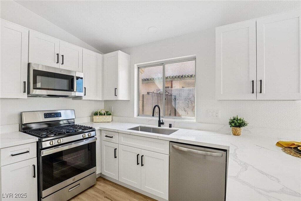 This beautifully renovated single-story home offers exceptional access to the 95 Freeway and Summerlin Parkway, placing you minutes from shopping, dining, and entertainment. Inside, you’ll find a thoughtfully upgraded 2-bedroom, 2-bath residence spanning 1,130 square feet with a bright, open layout designed for modern living. Nearly every surface has been updated, featuring new Luxury Vinyl Plank flooring, white shaker cabinets, quartz countertops, stainless steel appliances, and custom tiled bathrooms that give the home a luxurious, turnkey feel. Step outside to enjoy fresh desert landscaping, creating great curb appeal with low maintenance and clean design. The attached two car garage provides plenty of storage and convenience. Whether you’re a first-time buyer, looking to downsize, or seeking a move-in-ready property near the heart of Summerlin, this home is the perfect blend of comfort, style, and location.