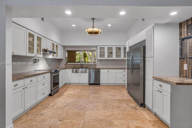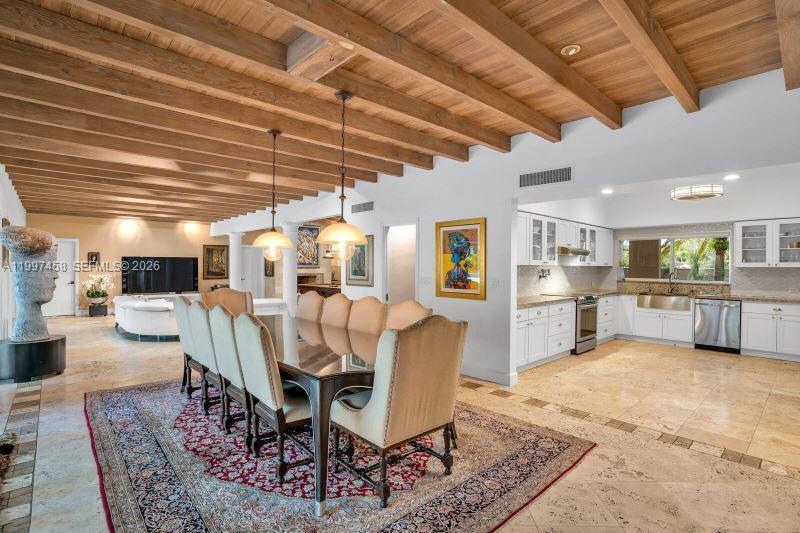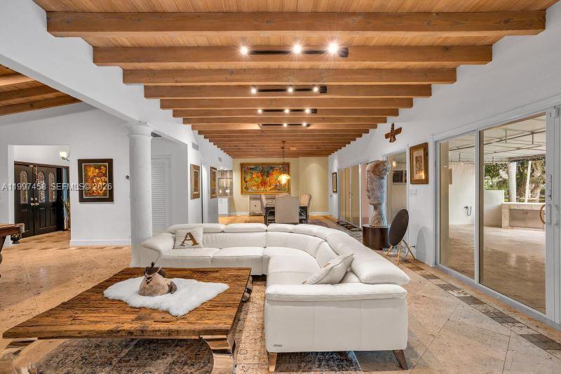 One-of-a-kind and genuinely Unique 5 bed, 5 bath home in South Miami with guest house, a one-story home with a huge patio, and a kidney-shaped pool surrounded by lush landscaping and Fruit Trees. Travertine floors throughout, large Main suite with double sinks, a large shower and a stand-alone tub, beautiful White Oak wood ceiling, fireplace, open floor through the living room, formal dining room, and the large open kitchen and Laundry room. The guest house has a separate entrance with a bedroom, living area, and kitchen area. This is a peaceful home in a quiet neighborhood yet close to everything. Dadeland Mall, the University of Miami, 20 minutes from Downtown Miami and Miami International Airport, and top-rated schools—Pool and Landscaping maintenance included. MLS # A11997458