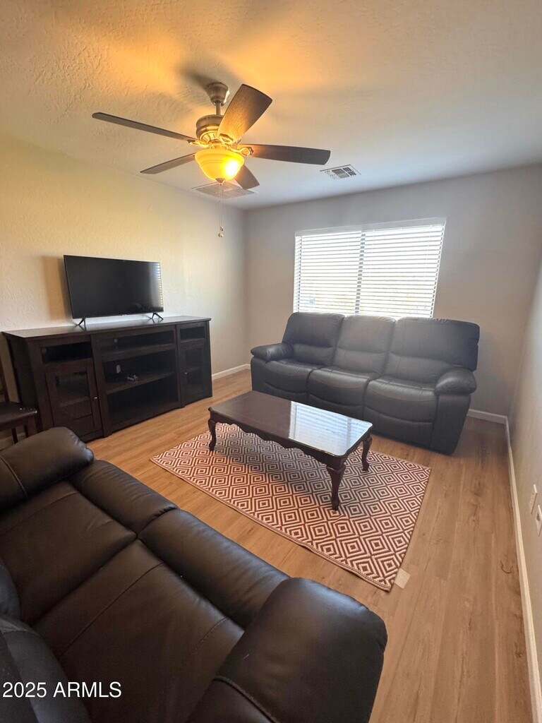 Spacious 2400+ Sq. Ft Single Family Home Features 5 Bedrooms,3 Bathrooms & Multiple Living areas. The Ground Level Offers a Living Room,an Oversized Kitchen with LOTS of Cabinets,A Family Room and a Cozy Dining Nook,A Bedroom & Full Bathroom plus the Laundry Room. The Upstairs Features a HUGE Master Suite With a Walk-in Closet,3 Additional Bedrooms,A Full Bathroom and An Inviting Living Room/Den. Laminated Wood Flooring and Tile - NO CARPET. The Backyard Borders a Greenbelt for Extra Privacy. Conveniently Located Near Cesar Chavez Municipal Park and Aguila Golf Course as well as Multiple Shopping Areas & Restaurants. All Appliances Are Included!