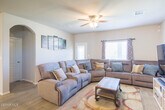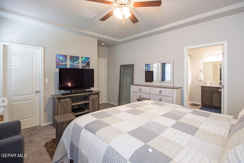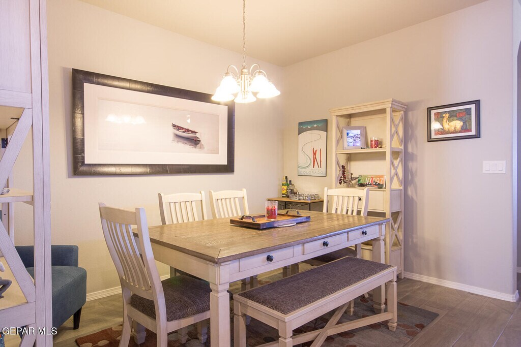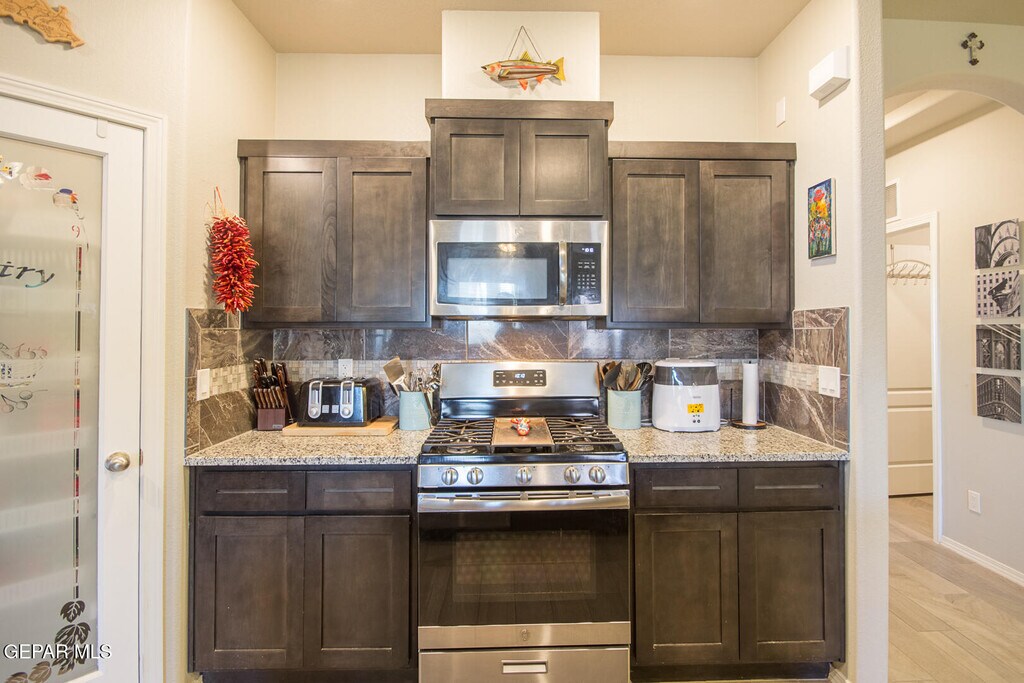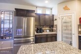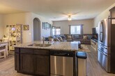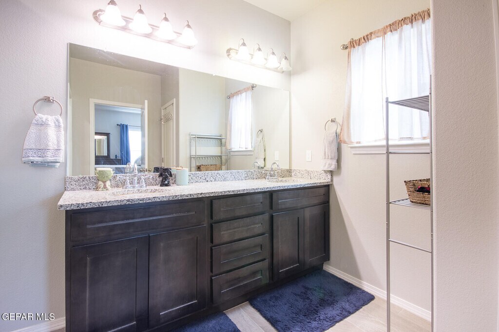 With a great view of the Franklin Mountains,this 1871 sq. ft. home features 4 bedrooms,3 bathrooms,and a 2-car garage. You enjoy the open concept floor plan from the kitchen to the dining area,and then flowing into the family area. The kitchen has dark walnut finished cabinets,stainless steel appliances,and granite countertops. The primary bedroom is located off the family room. Its spa bathroom has a double sink vanity and a walk-in shower. There are three other bedrooms,and one has its own dedicated bathroom. Other amenities are a large pantry,refrigerated air,a Samsung front-loading washer and dryer,and a landscaped backyard with a decorative pergola out the back door.