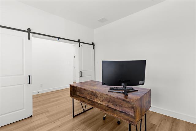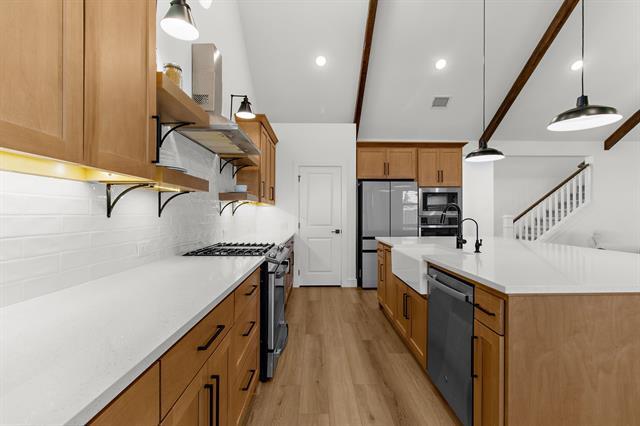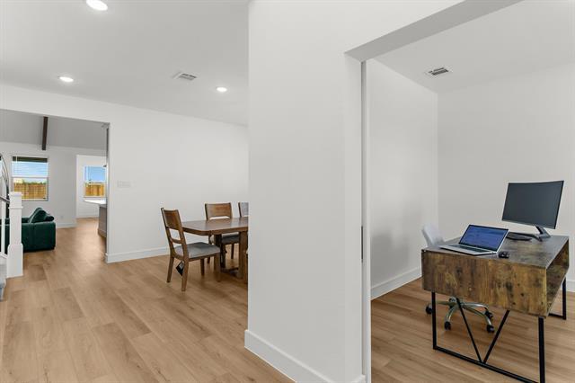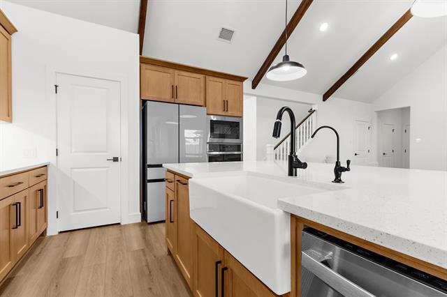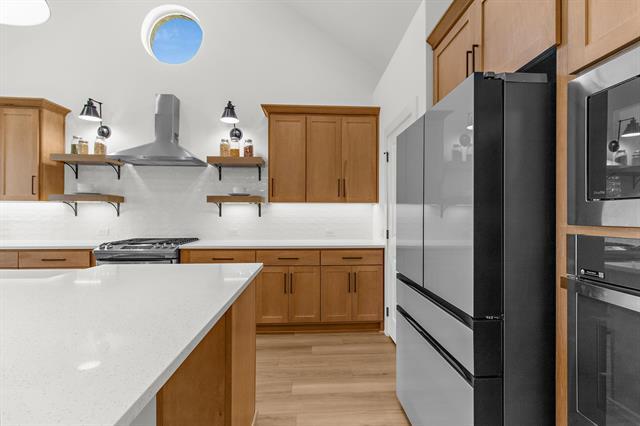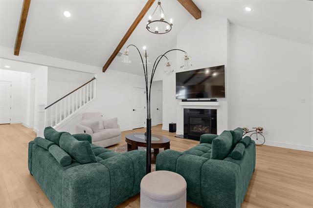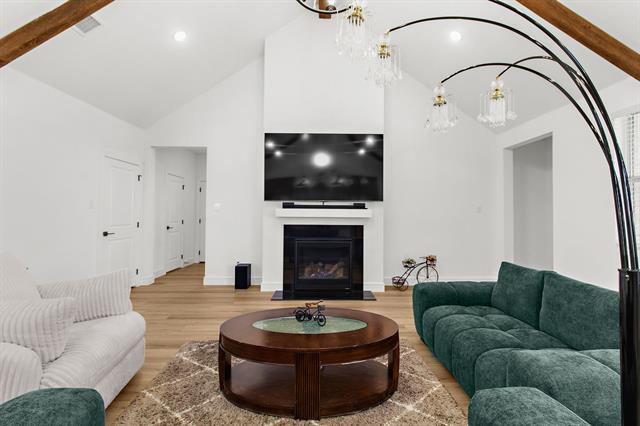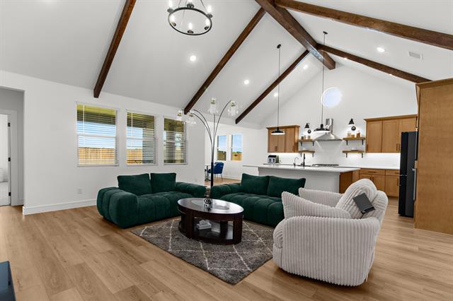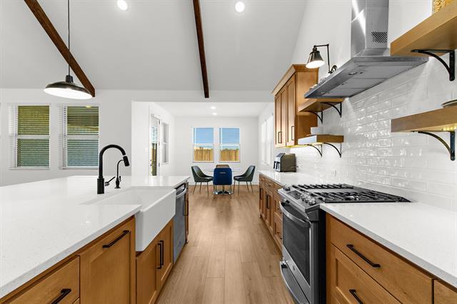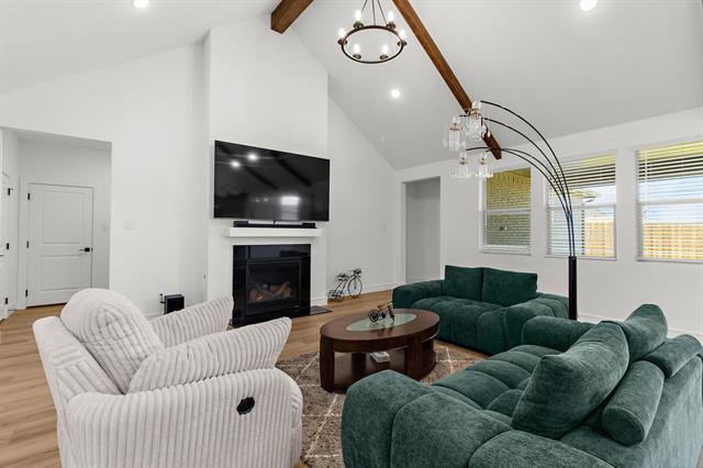 Welcome to this stunning residence, where vaulted ceilings and a gracious entryway introduce an elegant, comfortable home. A private office with double French doors is ideal for work or retreat. Entertain in the formal dining room, then gather in the sun-filled, open living area and farmhouse-style kitchen, featuring dramatic high accent beams, custom cabinetry, a farmhouse sink, accent shelving, a premium gas range, double ovens, a refrigerator, and a spacious island with a breakfast bar. Adjacent, an oversized breakfast room offers a charming spot for relaxed mornings. The inviting living room features a cozy fireplace and a wall of windows that fill the space with natural light and lovely views. The primary suite is a true retreat, featuring a sitting area and a spa-inspired bath with dual vanities, a freestanding soaking tub, and a large walk-in shower equipped with a rain shower head. Additional conveniences include a spacious laundry room equipped with a whole-home water softener and a guest powder room. Upstairs, you'll find a generous game room, two spacious bedrooms, a full bath, and a versatile bonus storage or hobby closet. Elegant wood-look flooring flows throughout the first floor (excluding bedrooms), complemented by custom light fixtures, and a three-car tandem garage offers plenty of space for vehicles, including longer trucks. The backyard is your personal oasis with a covered patio, perfect for gatherings or relaxing evenings. A new Amenity Center will elevate your lifestyle, while the community offers a dog park, fishing ponds, pool, scenic trails, fitness stations, and an event lawn. Schedule your showing today and experience the perfect blend of luxury, comfort, and community living! Washer, dryer & fridge included. If you want current furniture & housewares included, then it's an additional $300 per month.