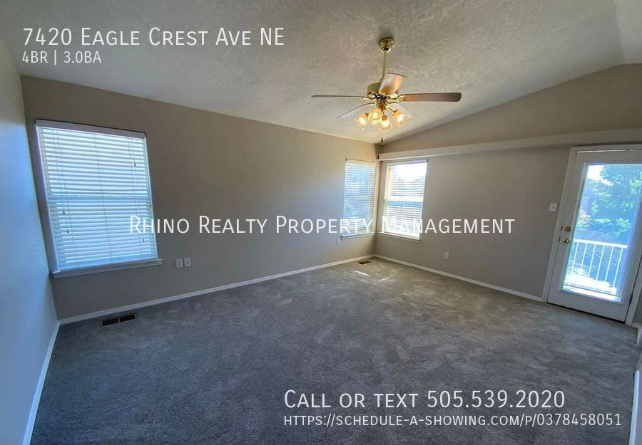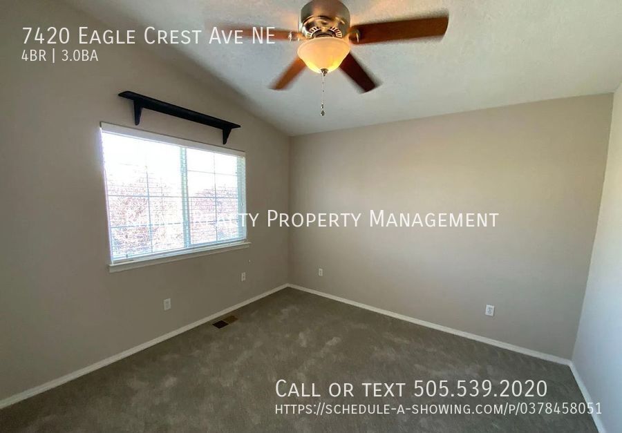 Welcome to 7420 Eagle Crest Ave NE, a beautifully maintained home nestled in a peaceful neighborhood near Noreste Park. This spacious 4-bedroom, 2-bathroom home offers a perfect blend of comfort, style, and convenience. Utilities: Resident is responsible for all utilities. Electric and Gas in resident's name. Water is paid through the tenant portal. Pet Policy: Cats and small dogs ok Up to 30lbs $300 non refundable pet fee Limit 2 Vehicle/Parking Policy: Limit 2 Vehicles Not Assigned *Tenant is responsible for landscaping along the exterior of the back yard wall, along the street. Potential Tenancy Fees: Please call to schedule a viewing! Or press the "Schedule a Showing" button on the property page! None