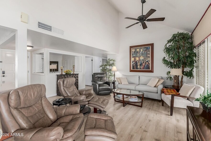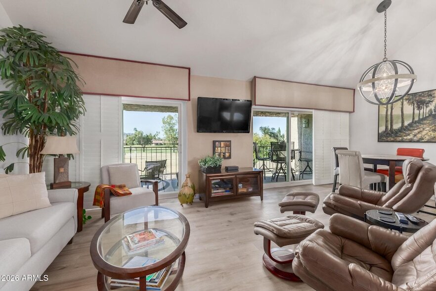 MONTHLY RENTAL ON MCCORMICK RANCH GOLF COURSE! Must See!! Available for 30-day rental,this gorgeous and recently updated 2/2 ground floor condo is a vacationer's dream. Located directly on the 5th hole fairway of McCormick Ranch Golf Club,enjoy the spacious floor plan,direct access to the golf course plus hike & bike trails,and two (2) year-round HEATED pools. This unit sleeps six (6),when the queen-sized pull-out bed in the living room is used for additional sleeping accommodations. The BEST PART is a massive 1000' sq ft patio with expansive 180 degree views of Camelback,surrounding mountains and the golf course. Residents of McCormick Ranch enjoy access to world-class golf,beautiful lakes,scenic greenbelts,and a vibrant social scene. This bright and well-appointed ground floor condo features stainless steel appliances,a huge central kitchen island with wine fridge,a 7 burner high-output searing gas grill,dual king sized beds,premium Marriott bedding & towels throughout,indoor and outdoor seating for 6+,three (3) 55 inch Smart TV's,Xbox Gaming System (non-internet),and VIEWS EVERYWHERE! Both bathrooms offer showers,with the guest bath featuring a bathtub/shower combo. This breezy unit offers screened sliding glass doors in the main space and master,as well as a heavy-duty metal mesh screen door with lock,allowing for wonderful front-to-back open air living in cooler times. The luxurious and spacious Primary Suite features a king bed,a 55" Samsung smart TV,an ensuite with closet,dressing area and two (2) vanities,one in the main bathroom and one in the closet/changing area. The entire unit features Marriott bedding and towels,creating a feeling of luxurious relaxation. The large picture window in this room has incredible views of Camelback and the golf course,and the sliding glass door provides easy entry to the patio and views extending to the McDowell Mountains. Conveniences include a kitchen that is well appointed with cookware,utensils and small appliances (Keurig coffee brewer,full-sized drip coffee maker,electric water kettle,Cuisinart food processor,air fryer,upright toaster,and refillable filtered water pitcher),as well as a dedicated 30+ bottle wine refrigerator,a full-sized refrigerator with ice maker and filtered water dispenser,and a dishwasher. Main lights are on easily adjustable dimmers to allow for maximum enjoyment of views in different lighting conditions. This rental includes place settings for six (6) individuals,as well as customary cookware,bakeware and utensils. What else could you want? How about a full-sized clothes washer and dryer,as well as an iron and ironing board! This well-designed unit also offers amply closet space throughout. But there is no question that the star of this super-comfortable unit is the massive 1,000+ sq ft wrap-around patio that encircles nearly the entire condo,and offers 180 degree views of Camelback Mountain (plus four other mountain ranges),the McCormick Ranch Golf Club (unit is on the 5th fairway of Pines Course),and the lake that runs throughout the course. This massive tiled patio can be accessed from any door in the house and features a complete outdoor dining area,a separate large outdoor living room with gas fire pit,a dedicated grill area,and three (3) additional separate seating areas. The outdoor living,dining and grill furniture and appliances were replaced with new in 2025. Depending on the season and time of day,this patio offers everything from full sun,to full shade in places,with many areas of dappled shade from large surrounding trees. The outdoor dining room features an expandable 6-person teak outdoor dining table (easy pop-out expansion leaf is stored in the table) with stackable weatherproof outdoor chairs,and an 8 ft roll-down sunscreen (for afternoon sun & overall privacy). This table is covered and largely sheltered from the wind (especially with screen rolled down),making it normally shady & quiet and great for reading,games,and creative pursuits. The table has views from Camelback to the McDowell Mountains,and of course the golf course & water. The outdoor living room might be the best living space in the place. This beautiful corner patio features a 3-person couch,four (4) individual armchairs,two sturdy,full-sized ottomans,a central coffee table/fire pit combo and side tables all covered by a massive adjustable cantilever umbrella. The entire space is enveloped in gorgeous and expansive 180 degree mountain,golf course and wildlife views. Common wildlife sightings from the patio include,bald eagles,hummingbirds,quail/partridge,ducks/geese/snowy egrets,rabbits,lizards,flocks of all kinds of different species of birds. The massive side patio houses a gas Monument 6-burner infrared high intensity searing grill with wood chip smoker box plus separate side burner the grill,plus a separate seating area for two. The side patio also has a convenient outdoor shed with a blower and broom,a hose reel,and a gate for exit on to the golf course or to walk to the Scottsdale Bike Path. It also makes a great space for yoga,stretching & light exercise. The large front patio has two additional private seating areas,one featuring Adirondack Chairs. This rental includes a 2-car car garage with an electric garage door opener. No indoor smoking/vaping. No Pets. This property uses a security surveillance system in all outdoor spaces at all times. No cameras or recording devices are located in interior spaces. We're Close to Everything! (Travel times will vary based on day of week,time of year & time of day) Recreation Scottsdale Bike Path - Enter from Development (Path Runs from Shea Blvd to Tempe Town Lake) Ride the Greenbelt to Old Town! 7 Golf Courses,9 Tennis Court Complexes & 9 Parks within 5 miles of condo Hike Camelback Mountain - 7 Miles / 15 Min Drive Dozens of different hikes with varying difficulties within 5 Miles of condo Major Attractions Old Town Scottsdale 4.5 miles / 10 Min Car Ride -or- 21 Min Bike Ride TPC Scotts